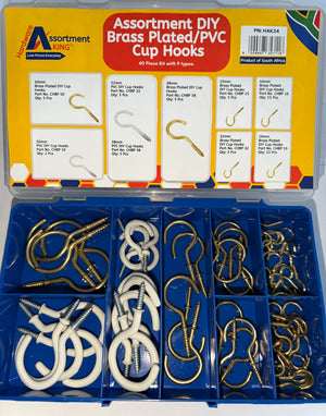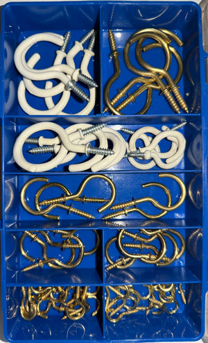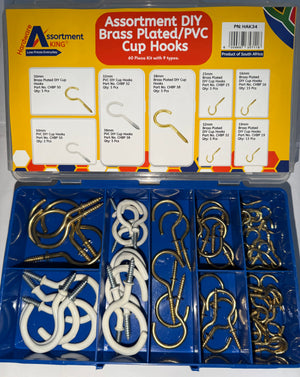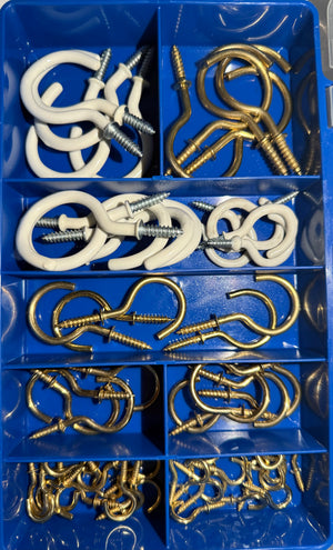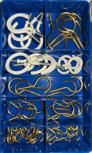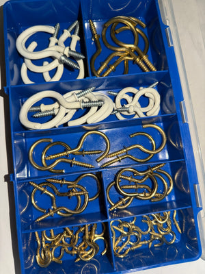 The HAK34 Cup Hook Assortment Kit includes a versatile 60-piece selection of brass plated and white PVC-coated screw-in cup hooks, ideal for DIY, home, and workshop applications. Designed for secure wall or ceiling installation, these hooks are perfect for hanging keys, cups, tools, decorations, and lightweight household items.