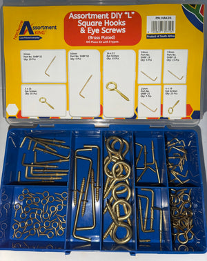 The HAK35 DIY Hook & Eye Screw Kit offers a 100-piece variety of brass-plated L-shaped square hooks and traditional eye screws, ideal for a wide range of light-duty hanging and fastening applications in the home, office, or workshop.
