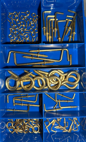 With multiple sizes of “L” square hooks and eye screws, this assortment is perfect for use in wood, walls, cabinets, or ceilings—whether you're organizing, decorating, or building. The brass-plated finish adds a touch of style while providing mild corrosion resistance.