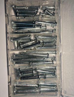The AAK109 Clevis Pin Assortment Kit provides a versatile selection of zinc-plated clevis pins engineered to DIN 1444 standards. Each pin features a precision cross-drilled hole for secure locking with cotter or split pins, making it ideal for mechanical linkages, pivots, and fastening applications that require frequent assembly and disassembly.