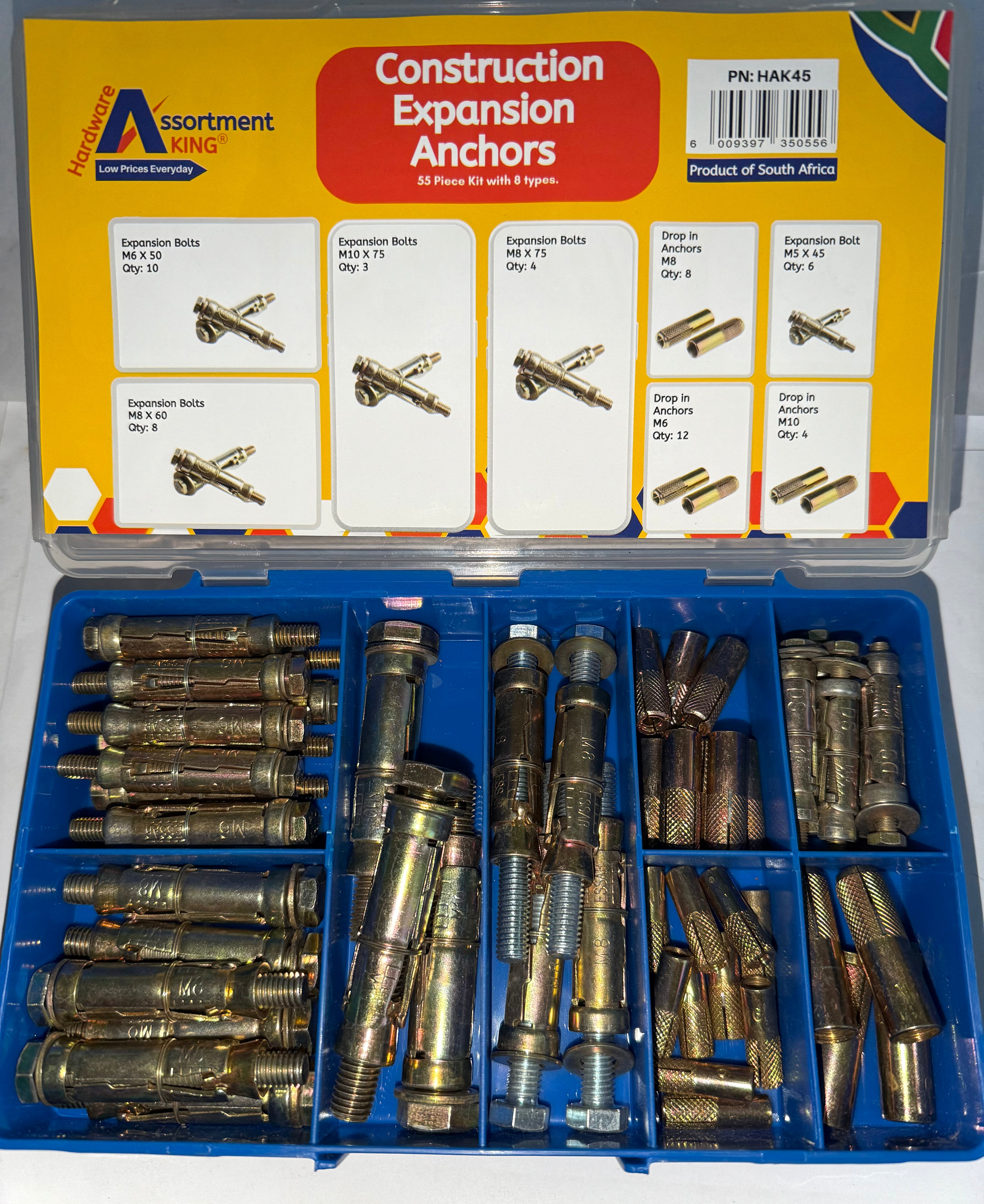 The HAK45 Expansion Anchor Kit offers a comprehensive 55-piece selection of zinc-plated construction expansion bolts and drop-in anchors in a range of M5 to M10 sizes. This high-strength assortment is designed for secure, load-bearing fastening into concrete, brick, and other masonry surfaces, making it ideal for both commercial construction and professional maintenance work.