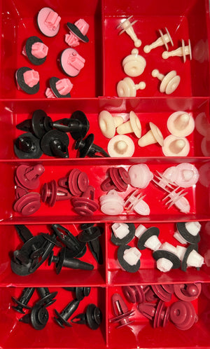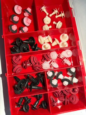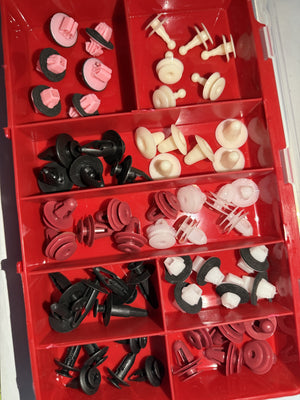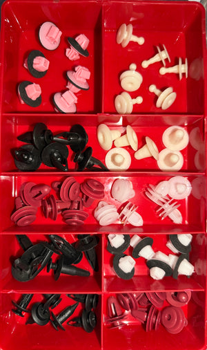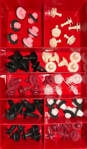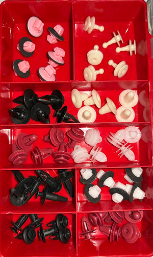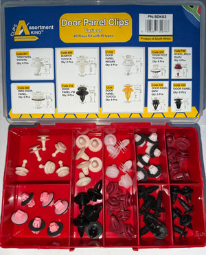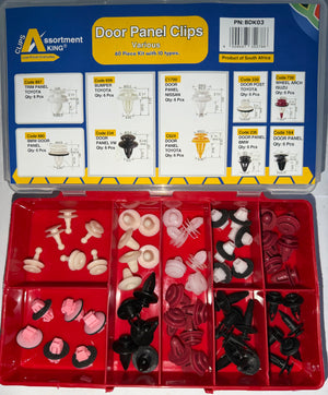 The BDK03 Door Panel Clip Kit is a comprehensive assortment of essential door and trim panel clips designed for secure fitment on a wide range of vehicle makes including Toyota, BMW, VW, Nissan, Isuzu, and more.