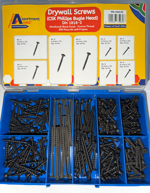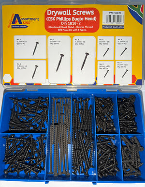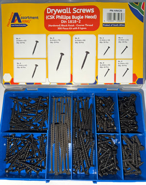 The HAK20 Drywall Screw Kit offers a versatile 300-piece selection of countersunk Phillips bugle head screws, designed to meet DIN 18182 standards. These self-tapping drywall screws are engineered for secure and flush fastening into drywall, gypsum board, wood, and light metal framing.