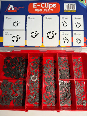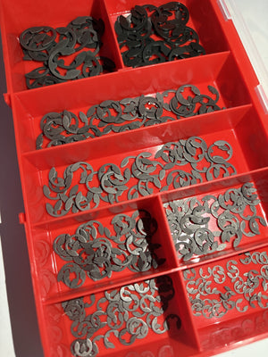 A practical solution for secure shaft fastening, this 300-piece Black E-Circlip Kit includes a range of DIN 6799 standard clips in multiple sizes. Finished in durable black oxide for corrosion resistance, these e-clips are ideal for automotive, mechanical, and general workshop use.