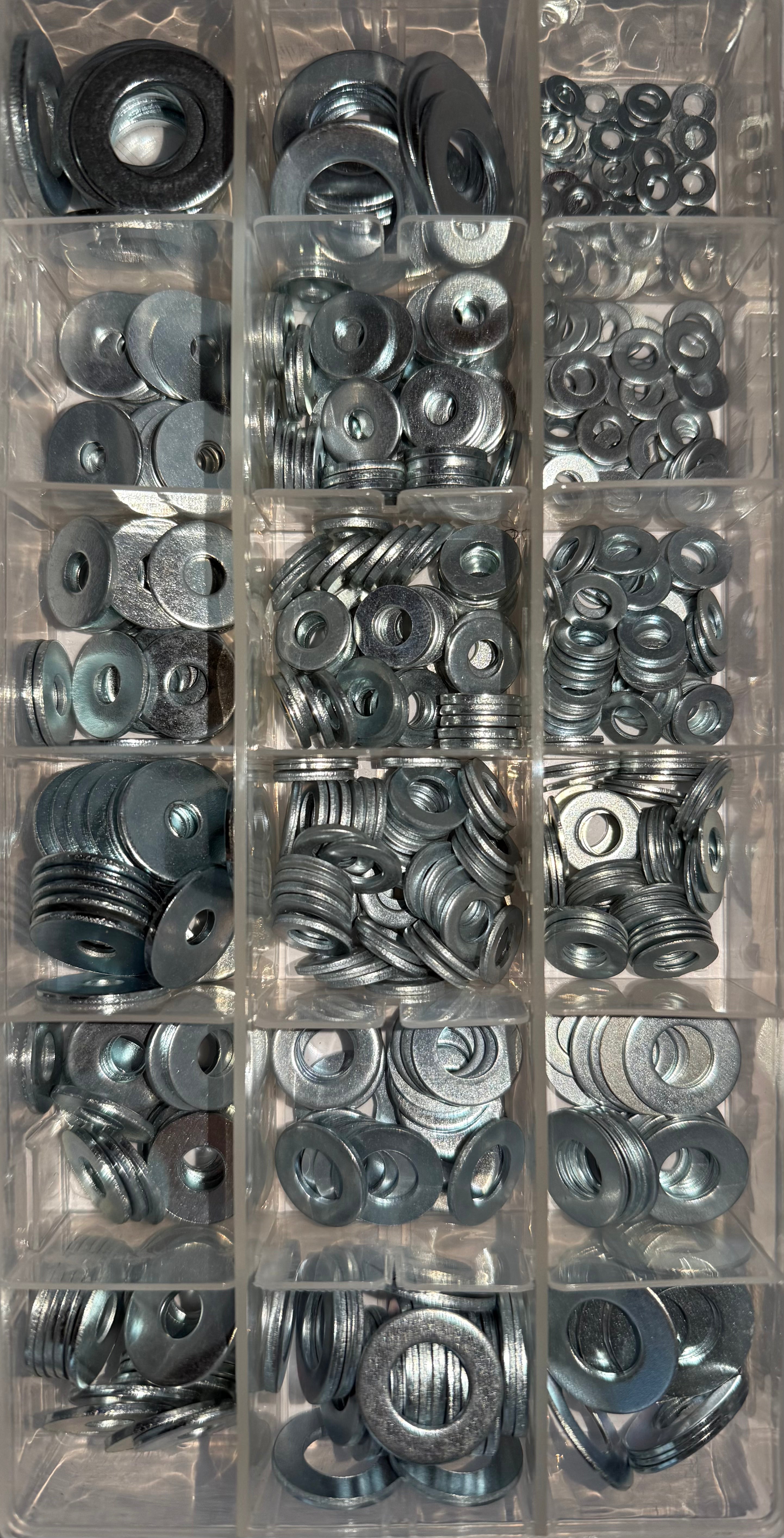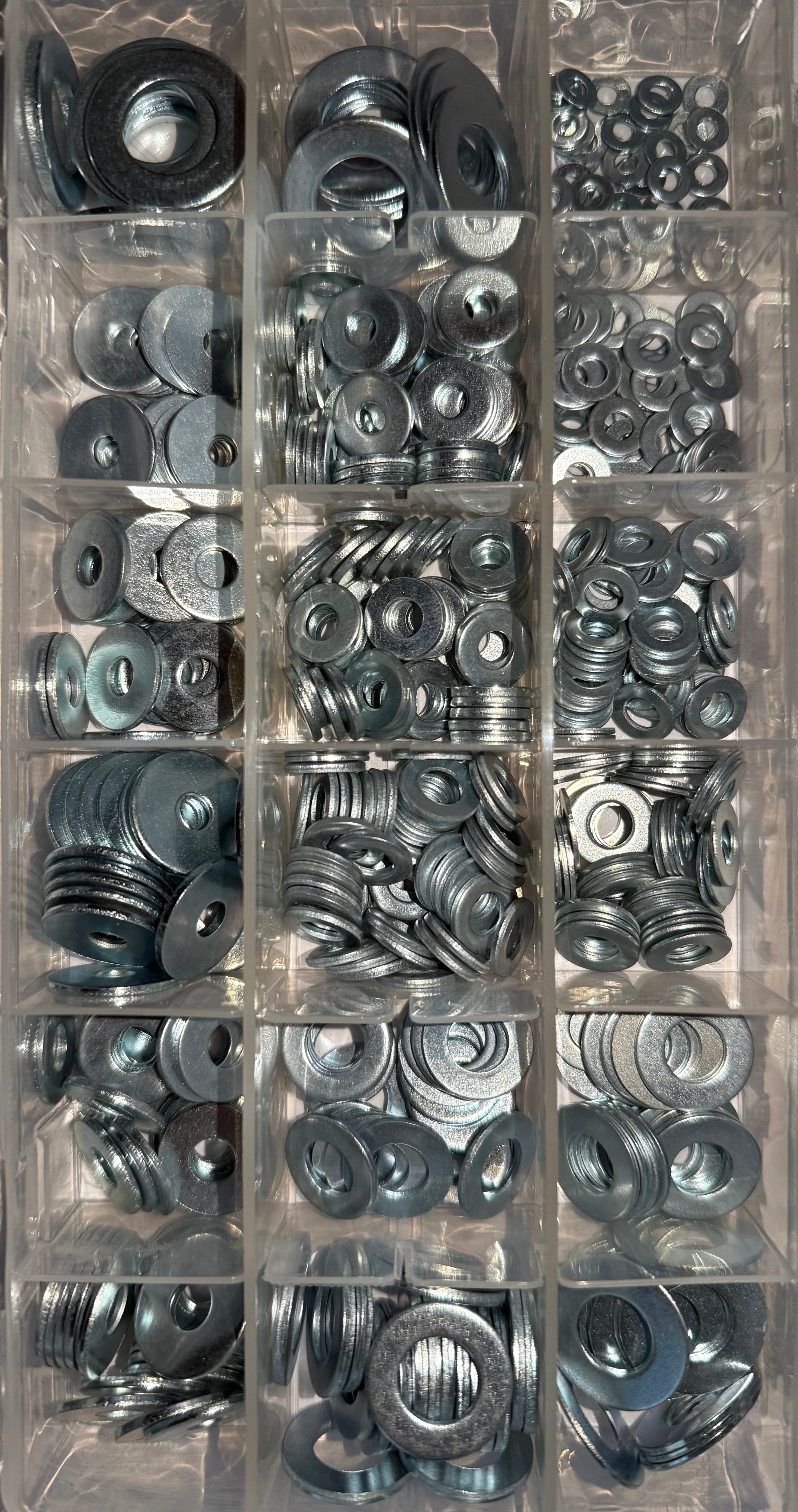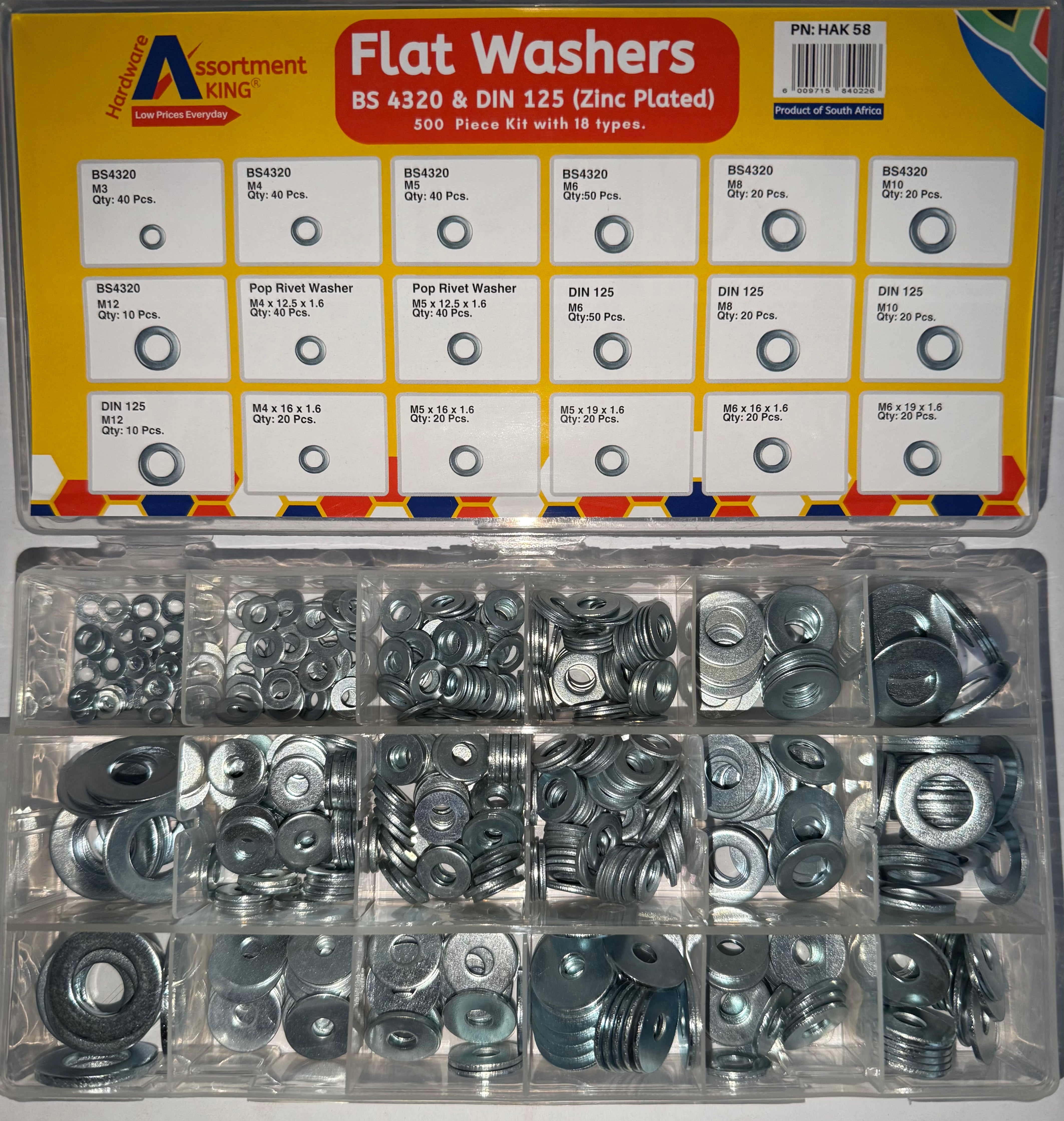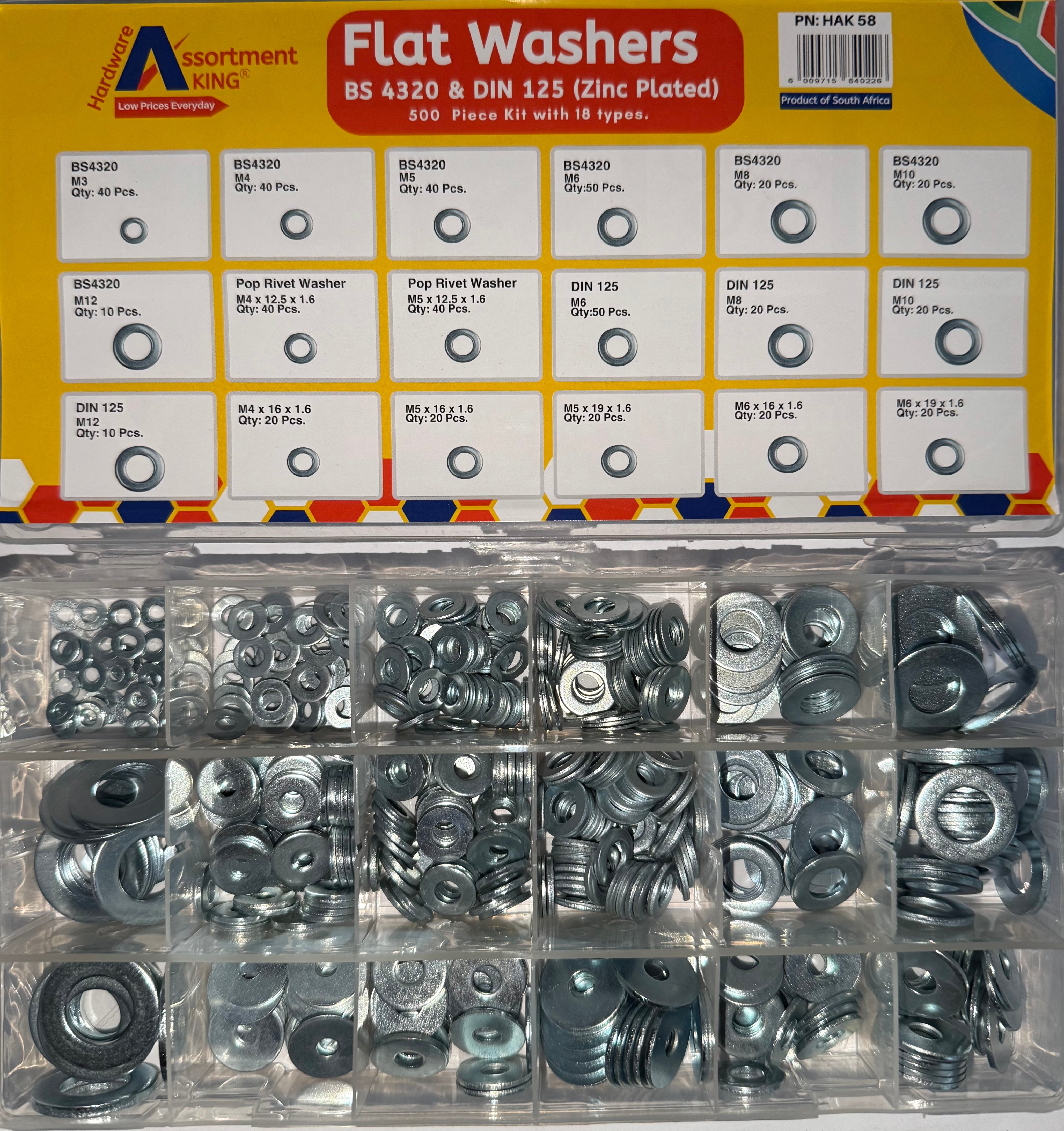 The HAK58 Flat Washer Kit offers a robust combination of BS 4320 standard, DIN 125 metric washers, and specialized pop rivet washers, all precision-engineered from zinc-plated steel to resist corrosion and deliver long-lasting performance. With a total of 500 pieces, this kit is a versatile addition to any toolbox, workshop, or industrial setting.