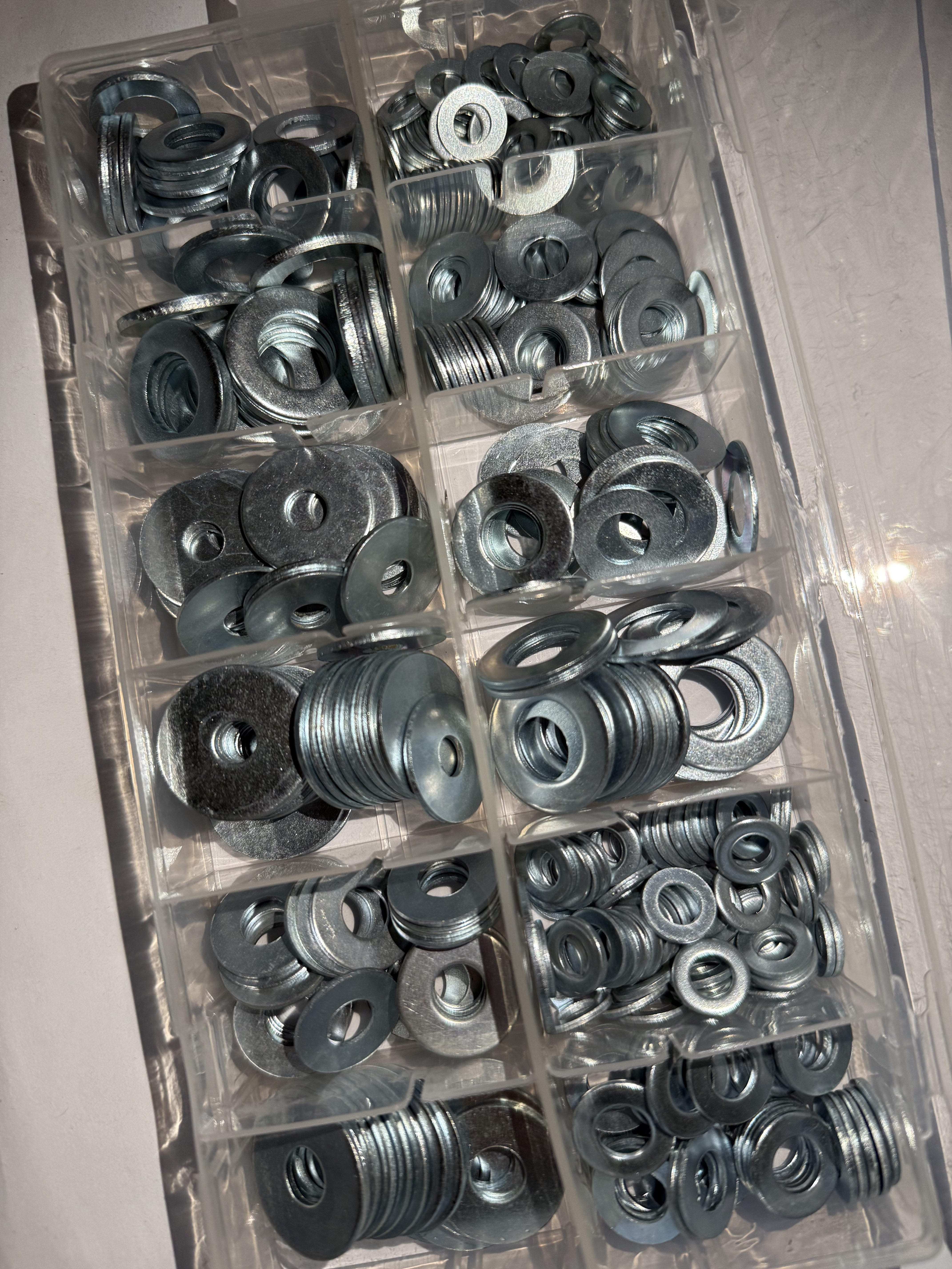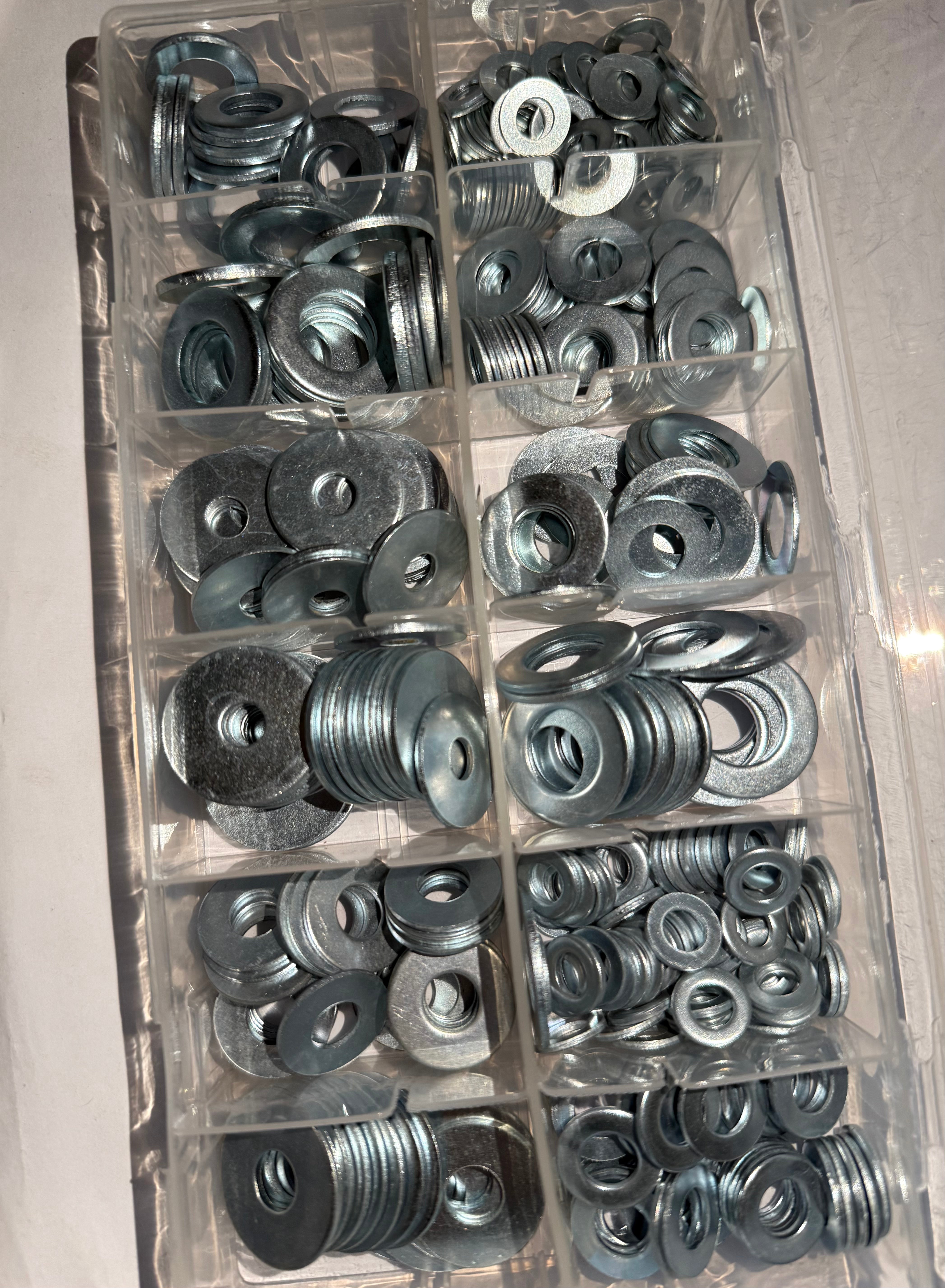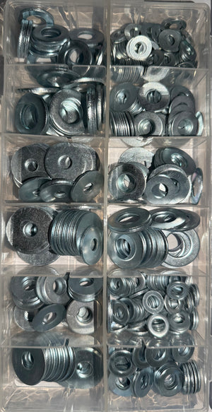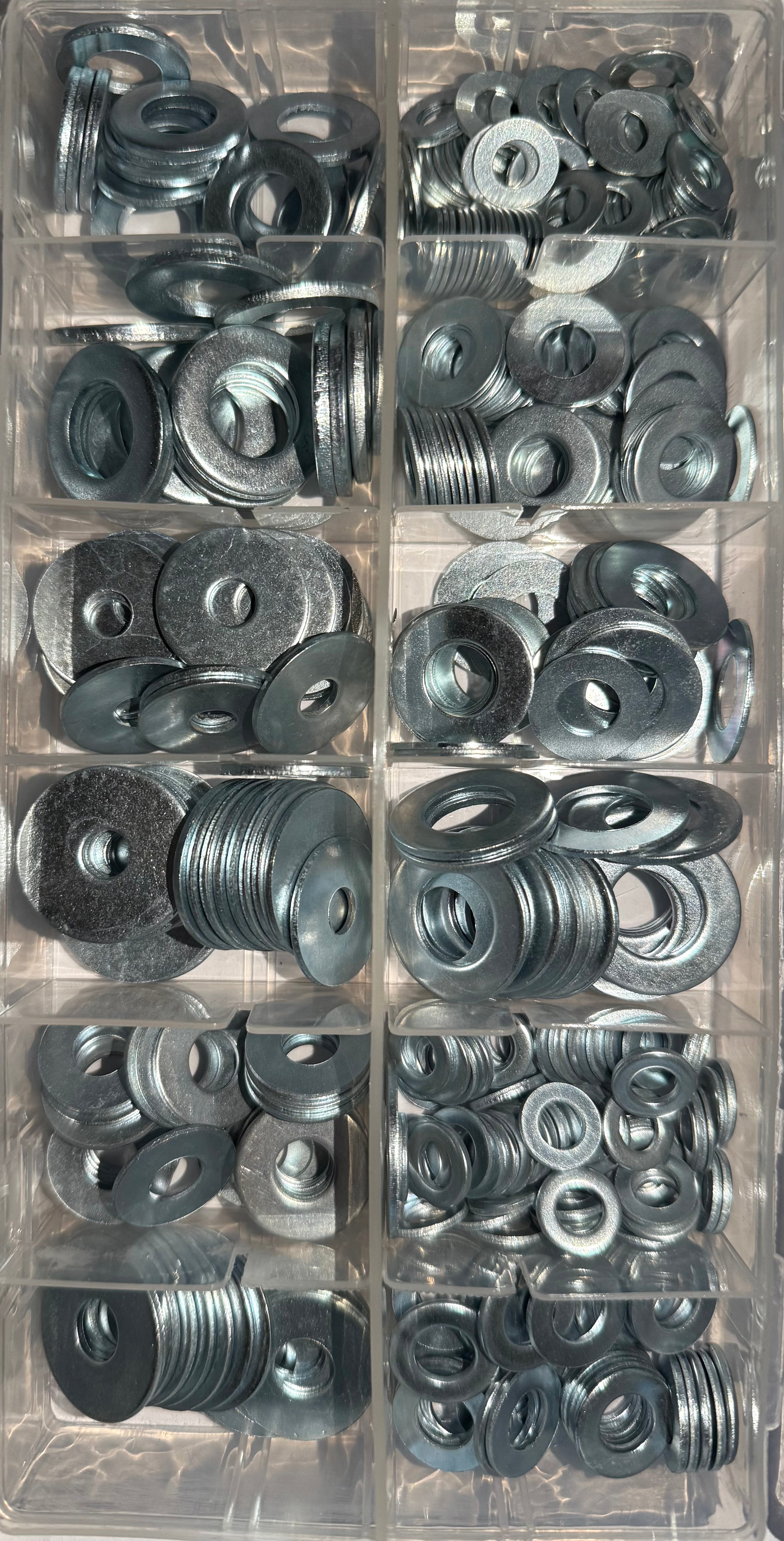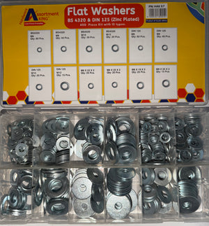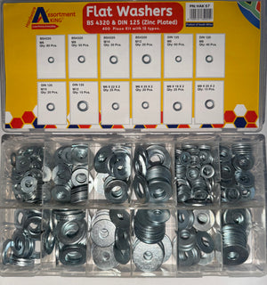The HAK57 Flat Washer Kit includes a comprehensive assortment of BS 4320 and DIN 125 standard washers, manufactured from zinc-plated steel for enhanced corrosion resistance and longevity. With a total of 400 pieces, this kit is ideal for workshops, industrial maintenance, fabrication, and general-purpose fastening applications.