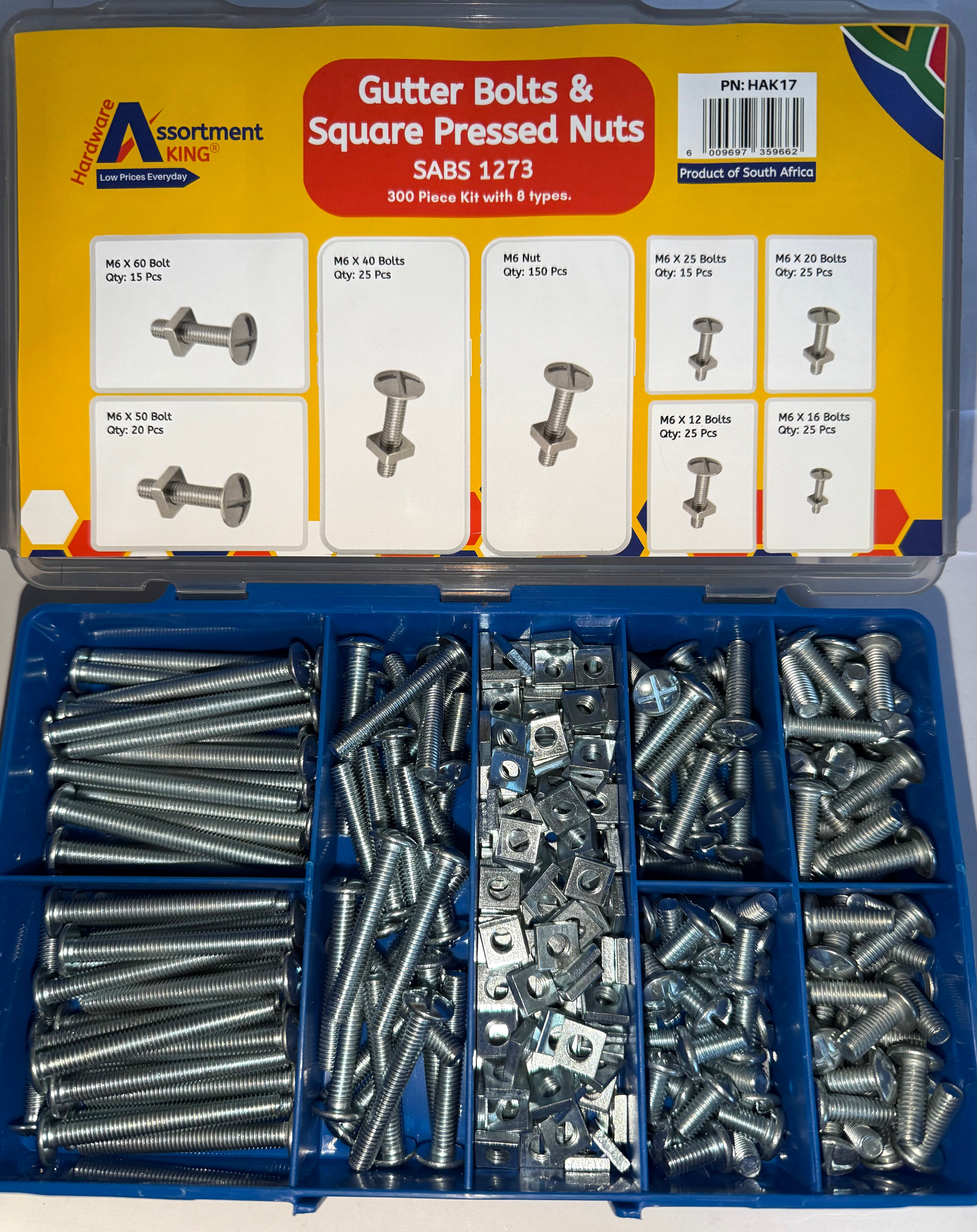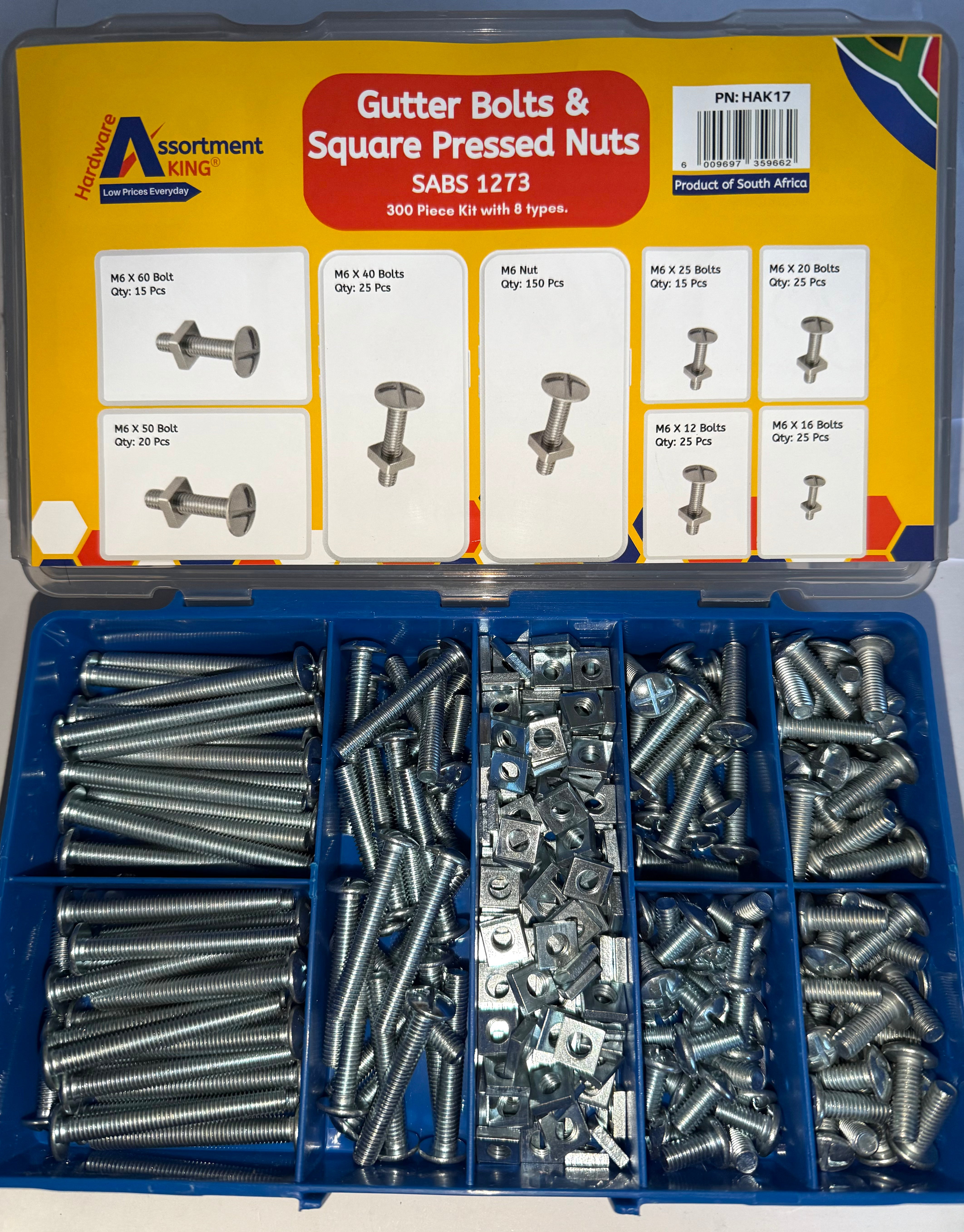 HAK17 Gutter Bolts & Nuts are high-quality fasteners manufactured to SABS 1273 standards. Designed for quick and easy installation, the domed head with slotted drive allows for clean aesthetics and tamper resistance. The square pressed nuts provide a secure and firm grip during assembly, making these ideal for applications in the roofing, rainwater guttering, and general construction industries.