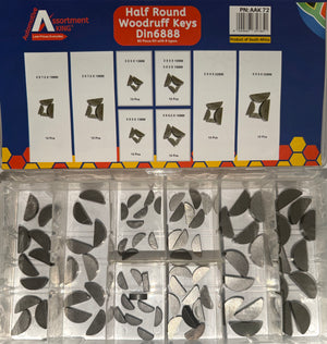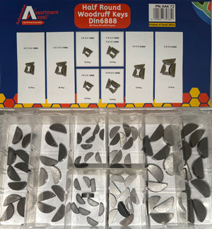 The AAK72 Half Round Woodruff Key Kit features an essential assortment of precision-engineered woodruff keys designed to fit curved keyways in shaft applications. Compliant with DIN 6888 specifications, these keys ensure reliable torque transmission and reduce stress concentrations in rotating assemblies.