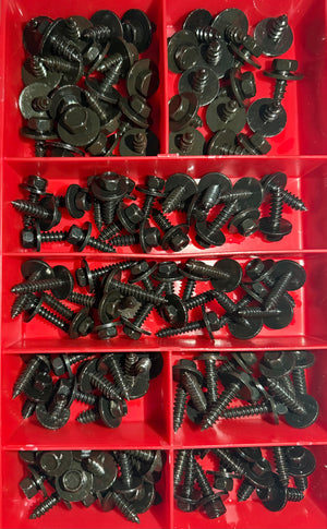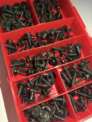 The AAK61 Hex Fender Screw Kit features 120 high-quality black phosphate self-tapping screws in assorted sizes, ideal for automotive bodywork, fender repairs, and general panel fastening. Built to DIN 7976 specifications, these screws ensure strong, corrosion-resistant performance.