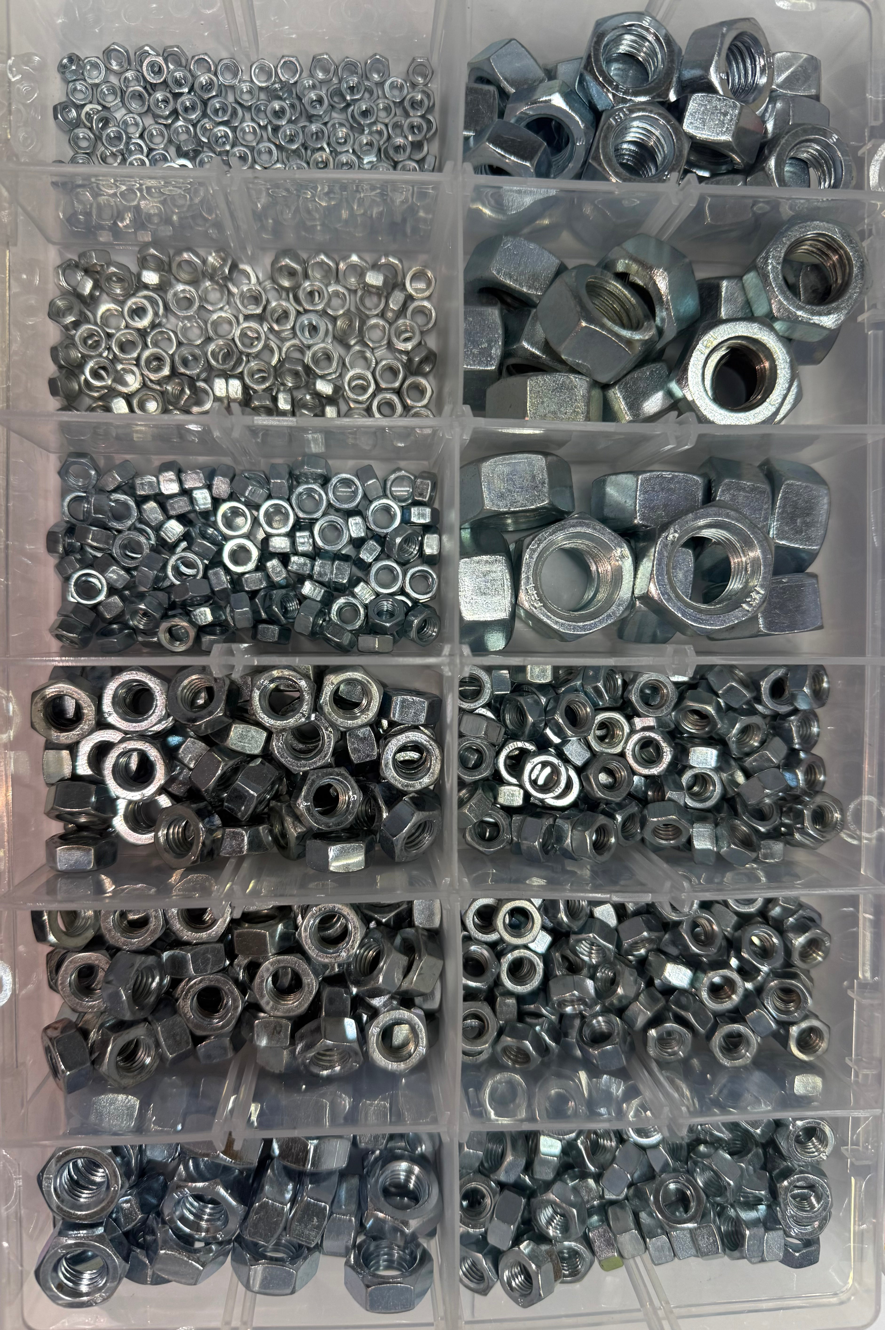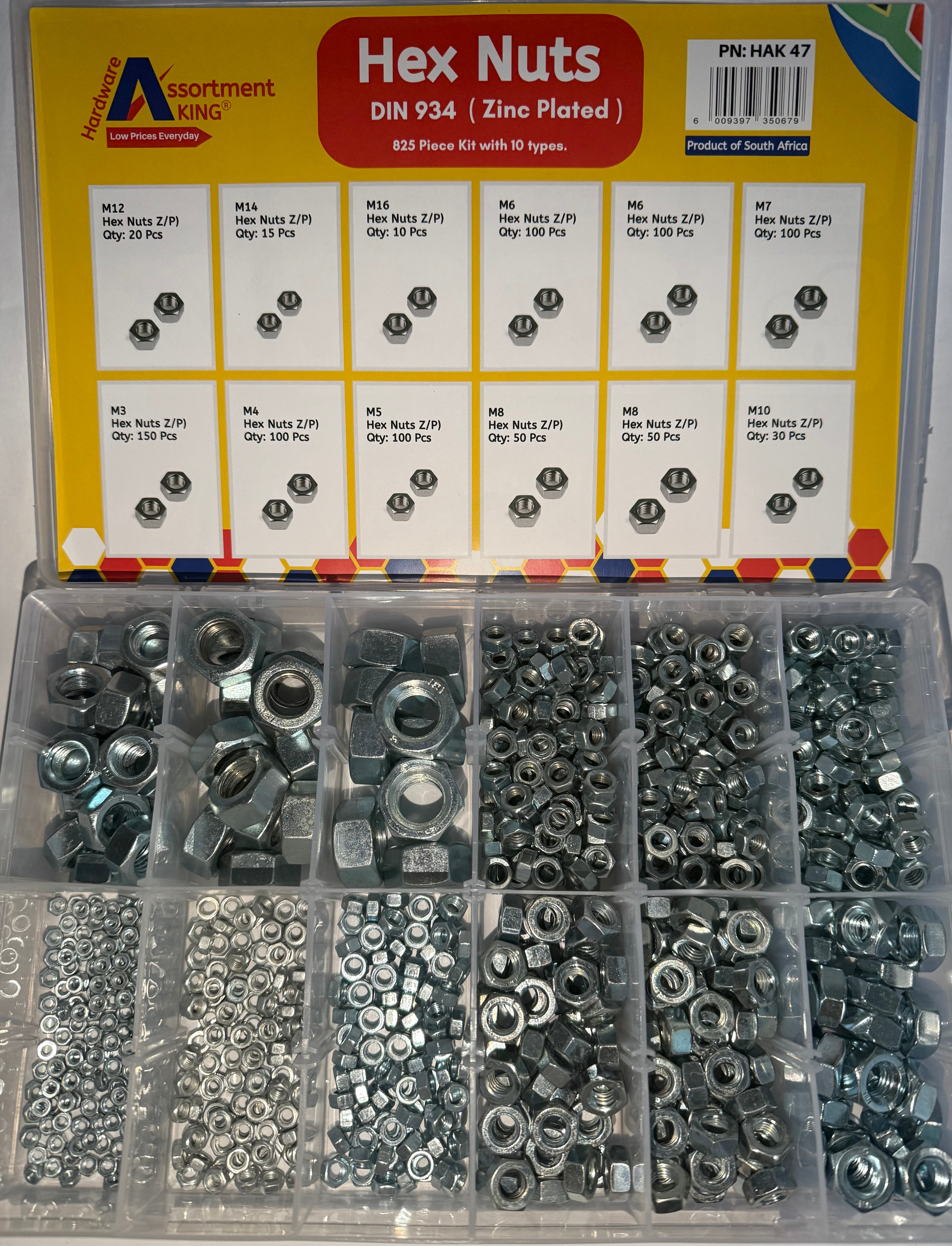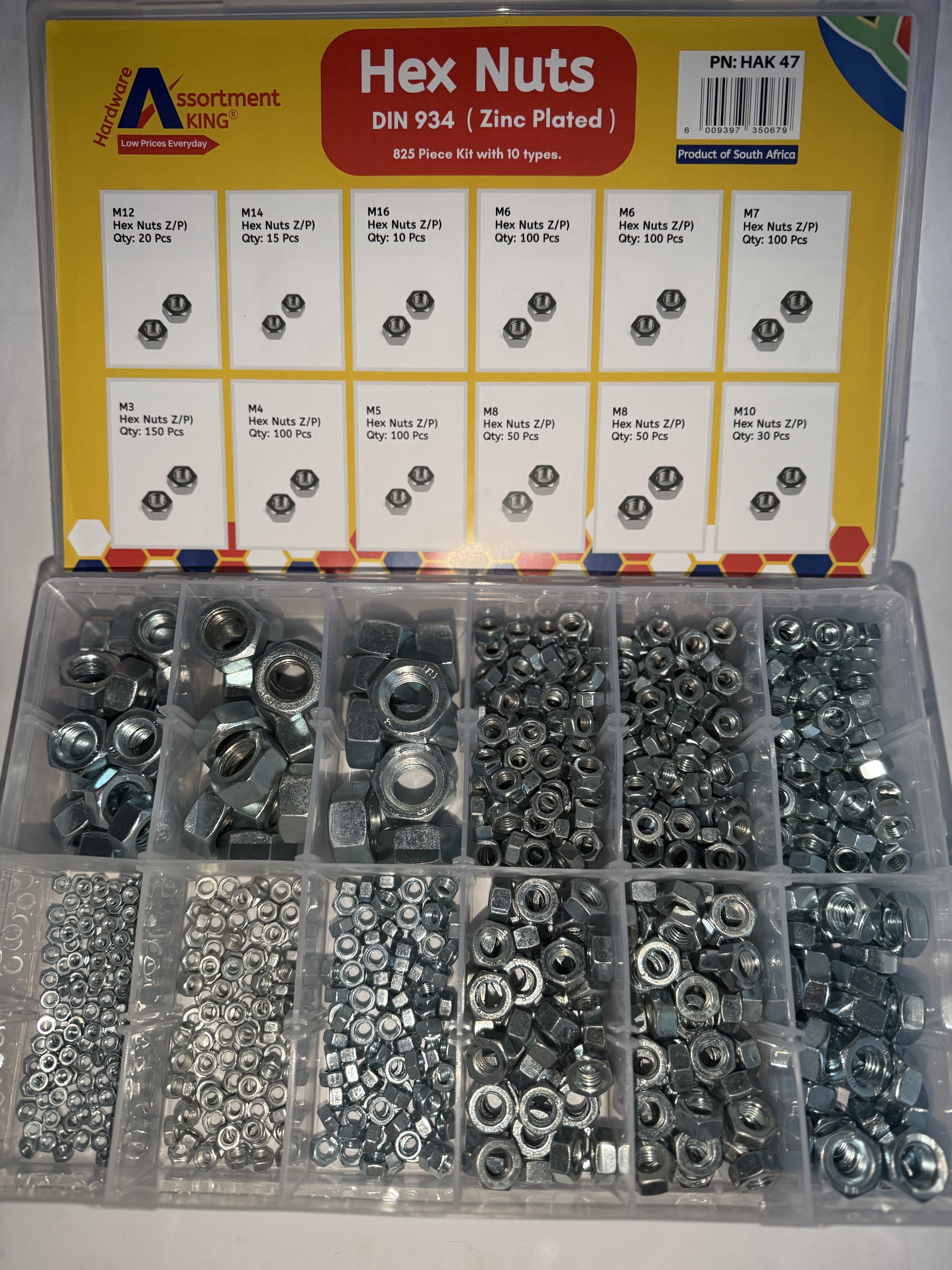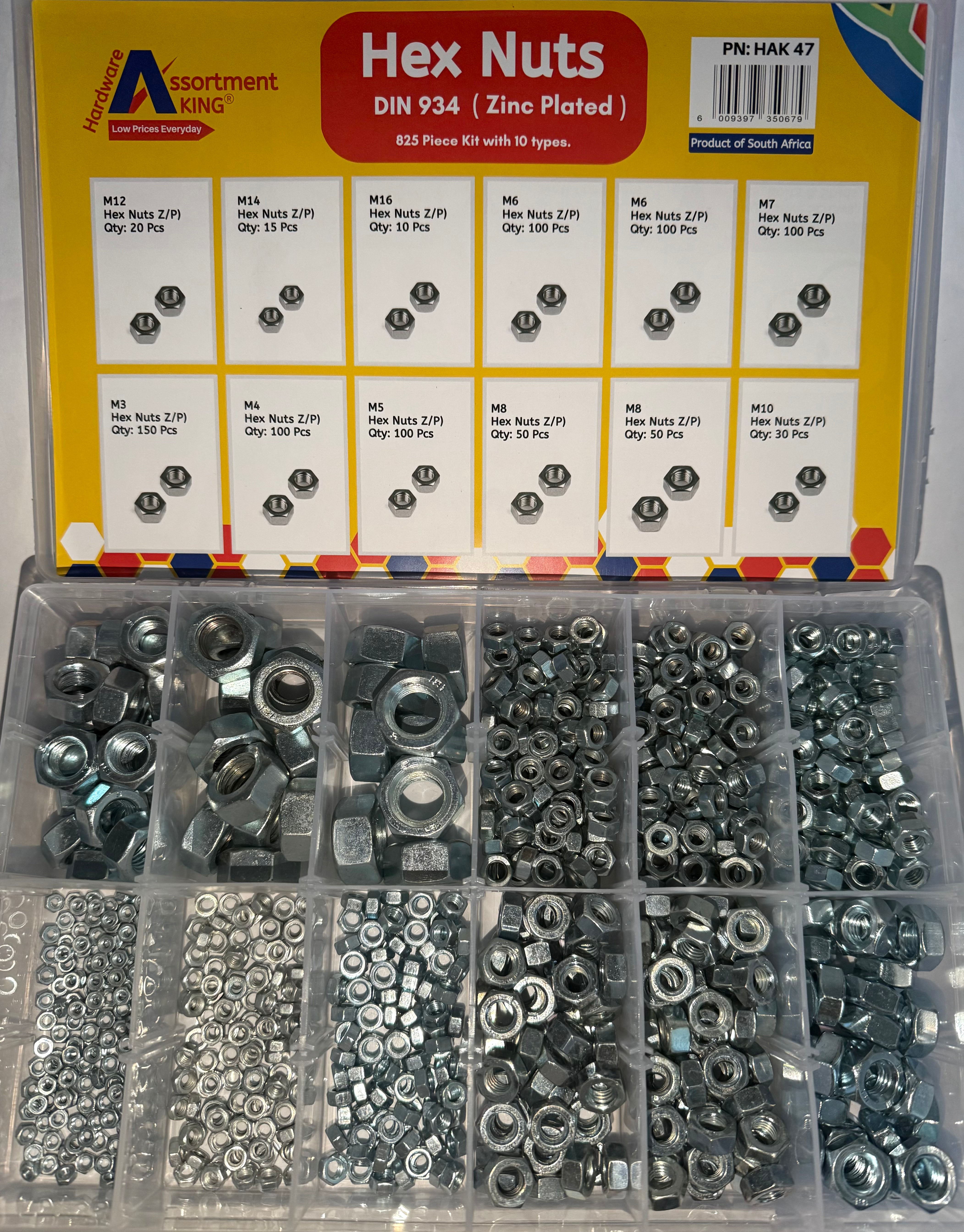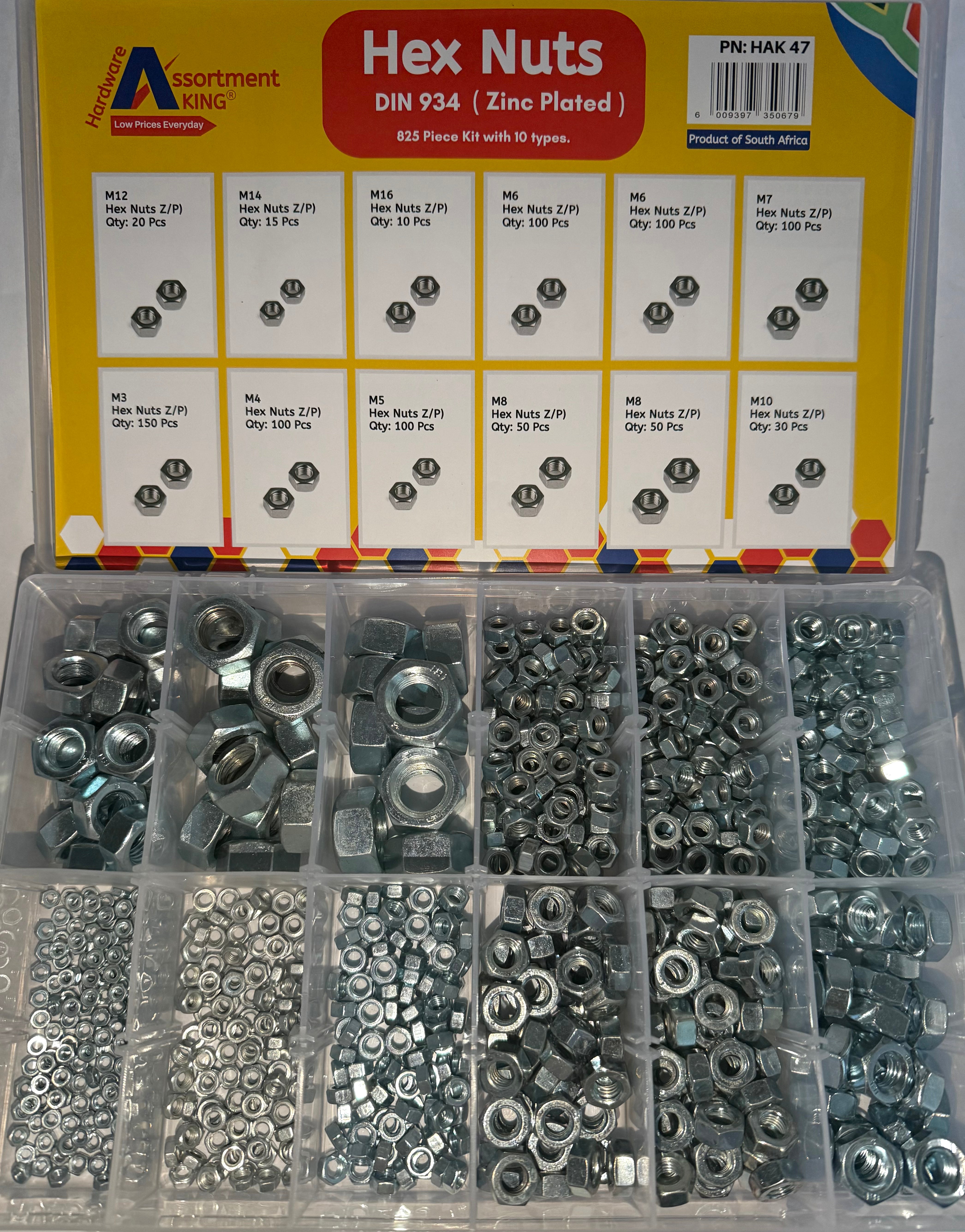The HAK47 Hex Nut Kit features a comprehensive 825-piece selection of precision-engineered zinc-plated metric hex nuts manufactured to DIN 934 standards. Designed for strength, durability, and corrosion resistance, these hex nuts are essential components in fastening applications across construction, automotive, mechanical, and general assembly industries.