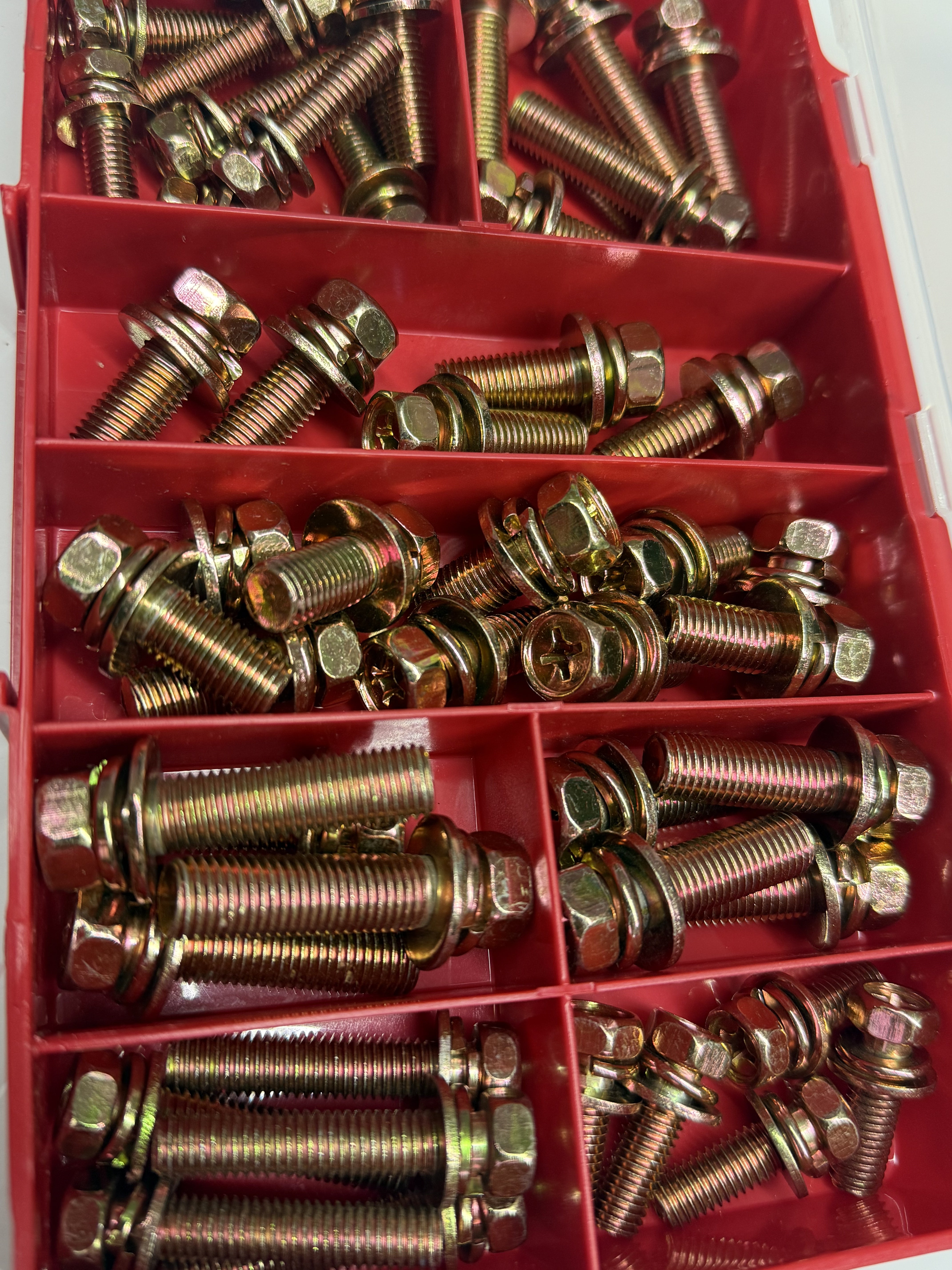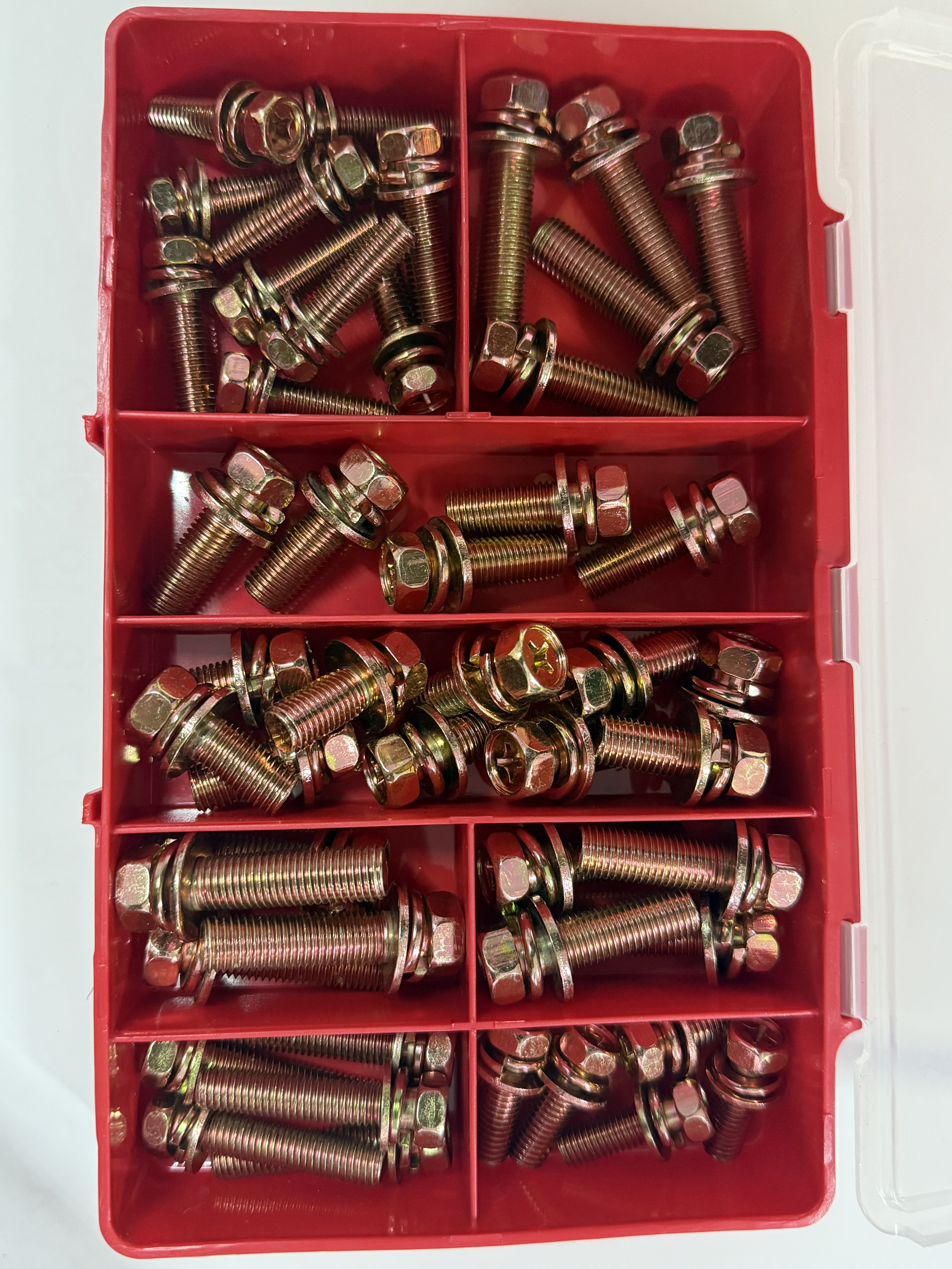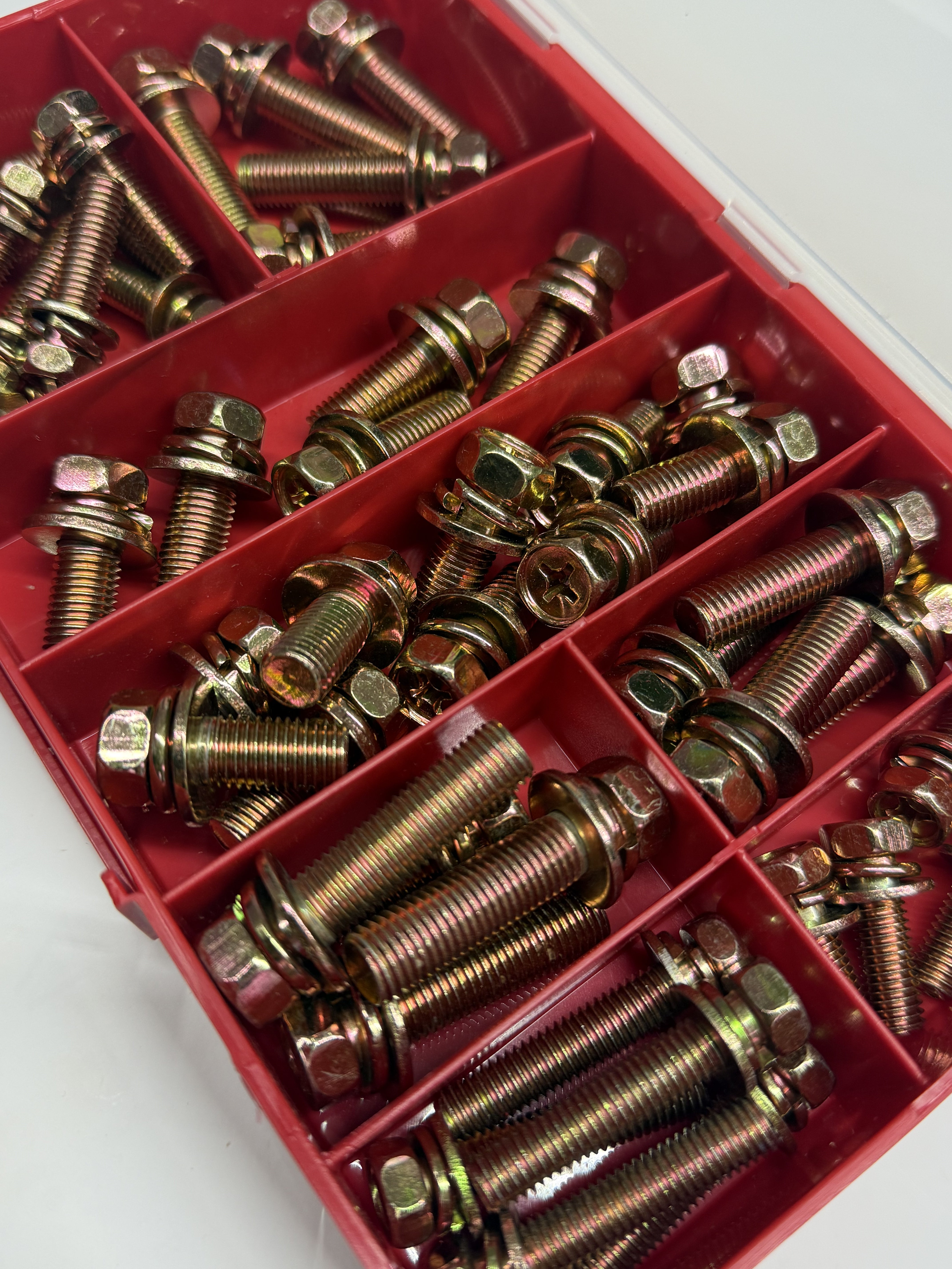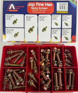 Designed for heavy-duty performance, this 50-piece assortment of Jap Fine Hex Sems Screws in large sizes is ideal for demanding automotive and mechanical applications. Featuring 8 distinct types, each screw adheres to Japanese automotive standards and comes with an integrated washer (SEMS) for faster, more secure installations. The yellow zinc finish offers excellent corrosion resistance while maintaining a clean, professional look.