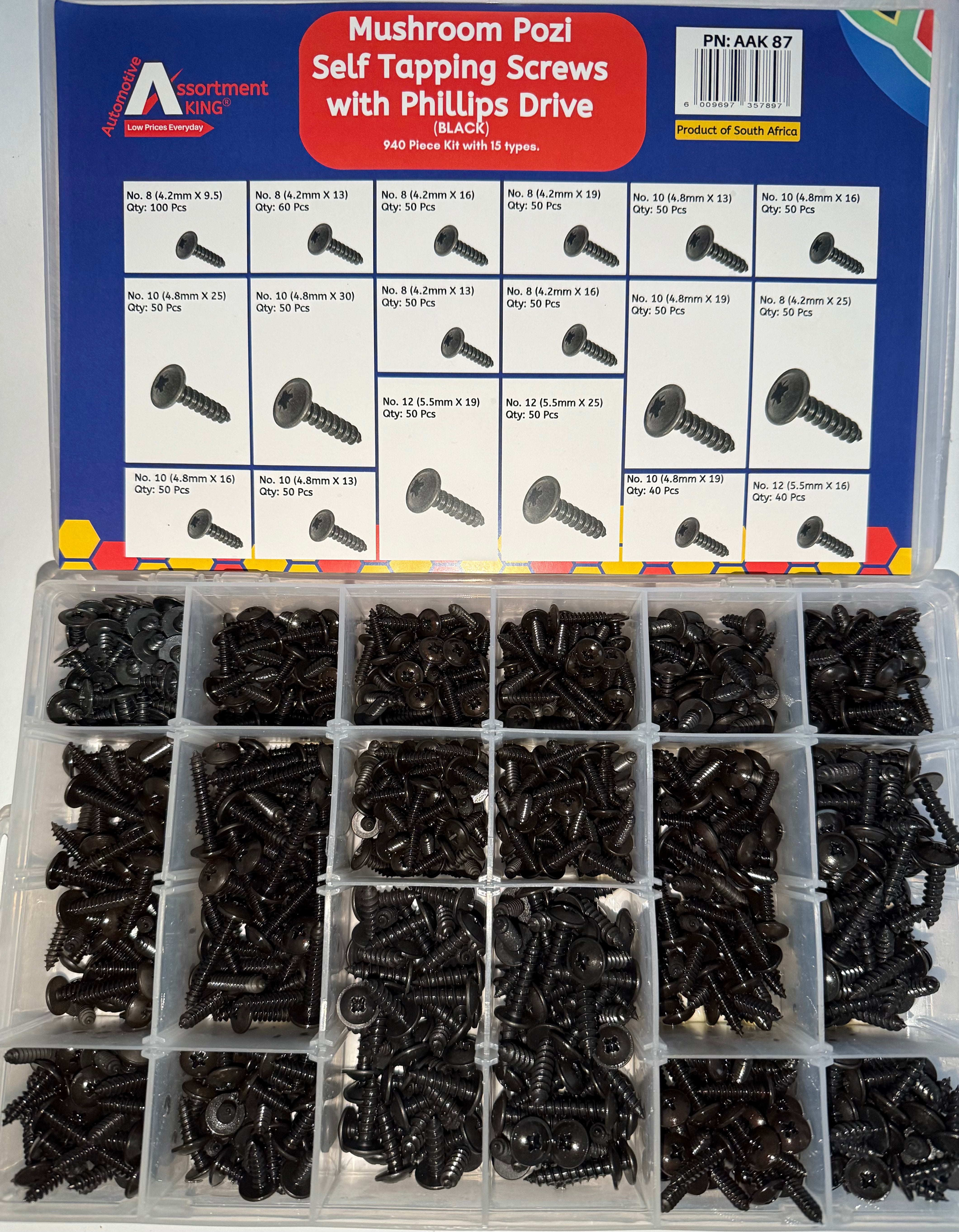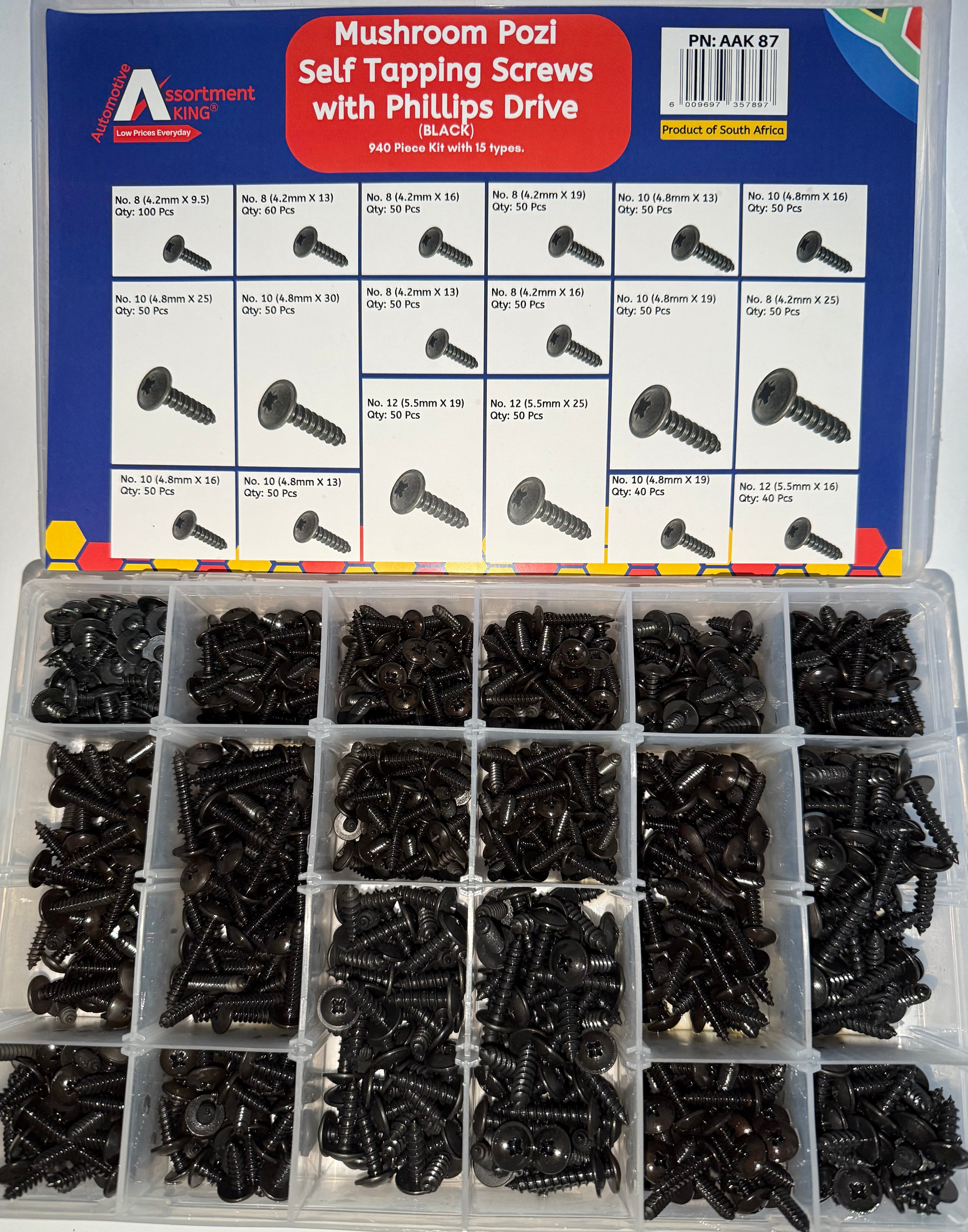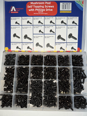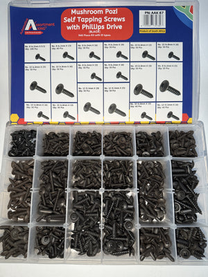 Ensure fast, secure fastening with the AAK87 Mushroom Pozi Self-Tapping Screws Assortment Kit — a comprehensive selection of precision-engineered screws designed for automotive, sheet metal, electrical enclosures, and general industrial use. The mushroom-shaped head offers a wide bearing surface, while the Pozi drive enables higher torque application with reduced cam-out, ideal for use with power tools or manual drivers.