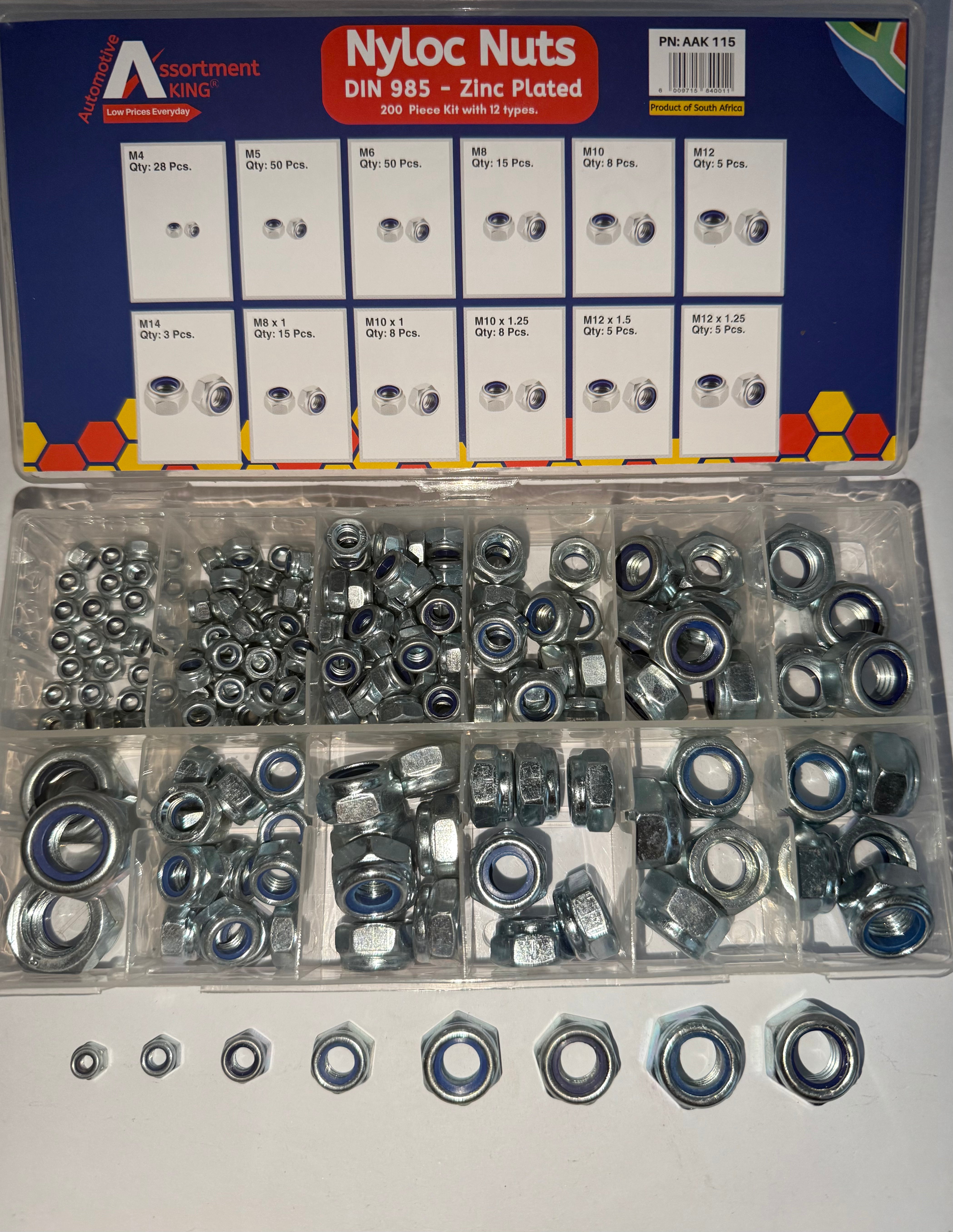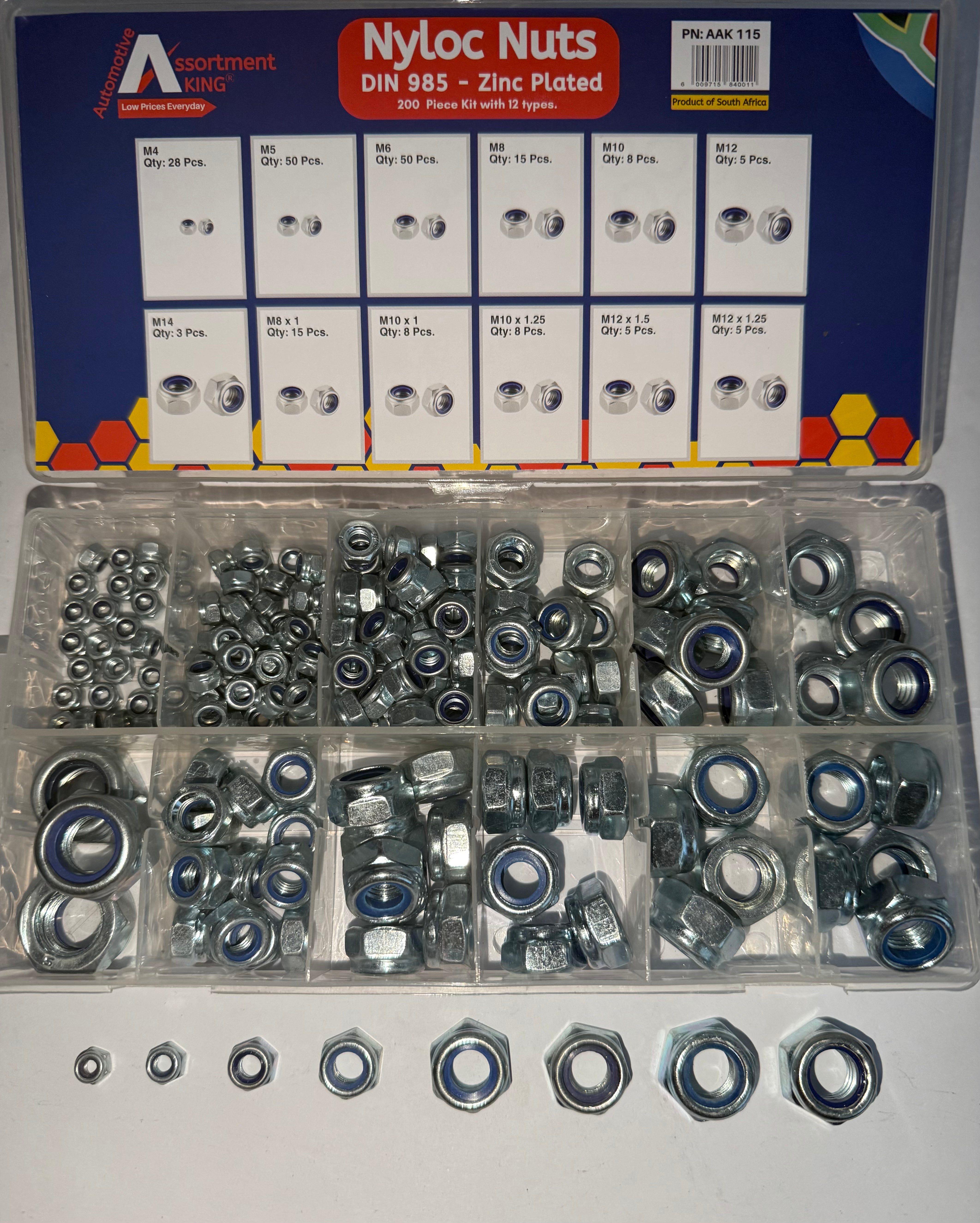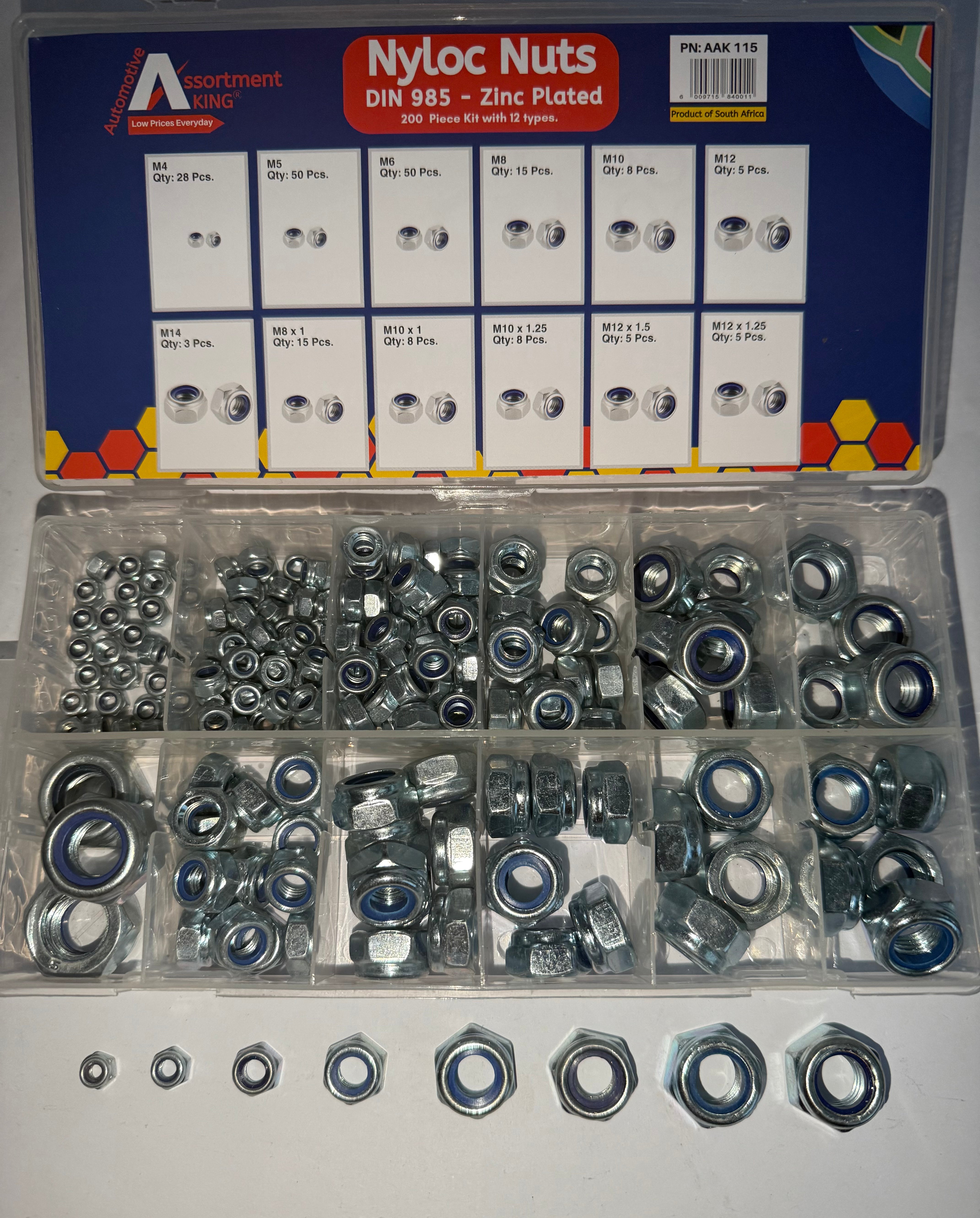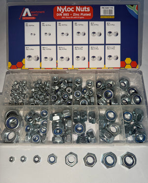The AAK115 Nyloc Nuts Assorted Kit features DIN 985-compliant self-locking hex nuts equipped with a durable nylon insert, providing a secure and vibration-resistant locking mechanism. These nuts are ideal for preventing loosening due to vibration or torque, making them perfect for automotive, machinery, and structural applications.