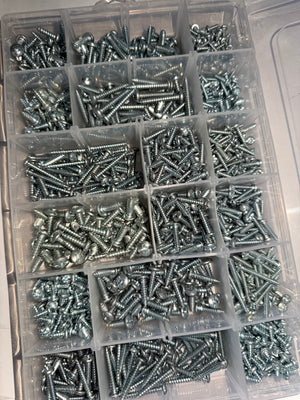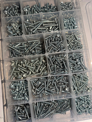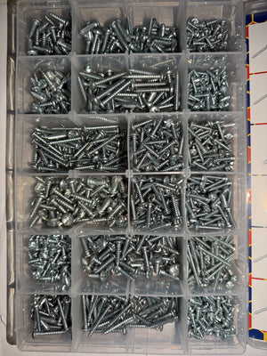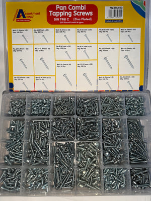 The HAK53 Pan Combi Tapping Screws Kit is a comprehensive 1,250-piece assortment of high-performance zinc-plated self-tapping screws manufactured to DIN 7981C standards. These screws feature a pan combi head suitable for both Pozi and slotted drivers, making them ideal for multi-tool compatibility and efficient fastening.