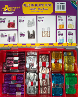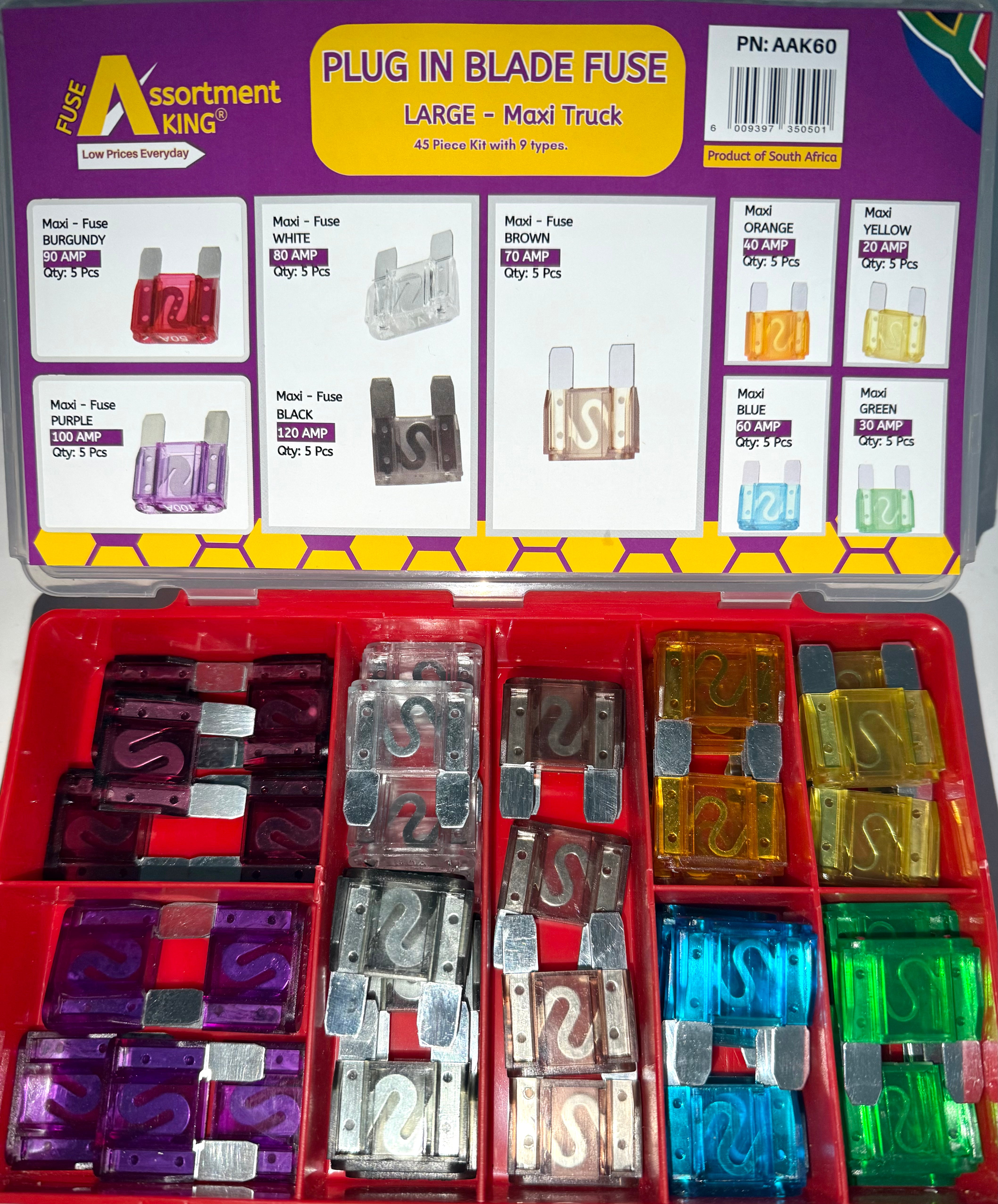 The AAK60 Maxi Plug-In Blade Fuse Kit is a heavy-duty 45-piece set designed for commercial vehicles, trucks, buses, and high-current automotive systems. With fuse ratings from 20A up to 100A, this kit ensures optimal circuit protection for high-load applications.