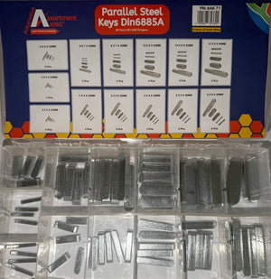 The AAK71 Parallel Steel Key Kit offers a convenient assortment of high-quality parallel machine keys designed to securely connect rotating machine components, such as gears and pulleys, to shafts. Manufactured to DIN 6885A standards, each key is made from durable steel for precision fit and high torque transmission reliability.