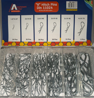 The AAK77 “R” Hitch Pin Assortment Kit is a durable and versatile collection of hairpin cotter pins conforming to DIN 11024 specifications. Designed for secure fastening of clevis pins and shaft assemblies, these “R” clips are commonly used in automotive, agricultural, and industrial machinery applications.