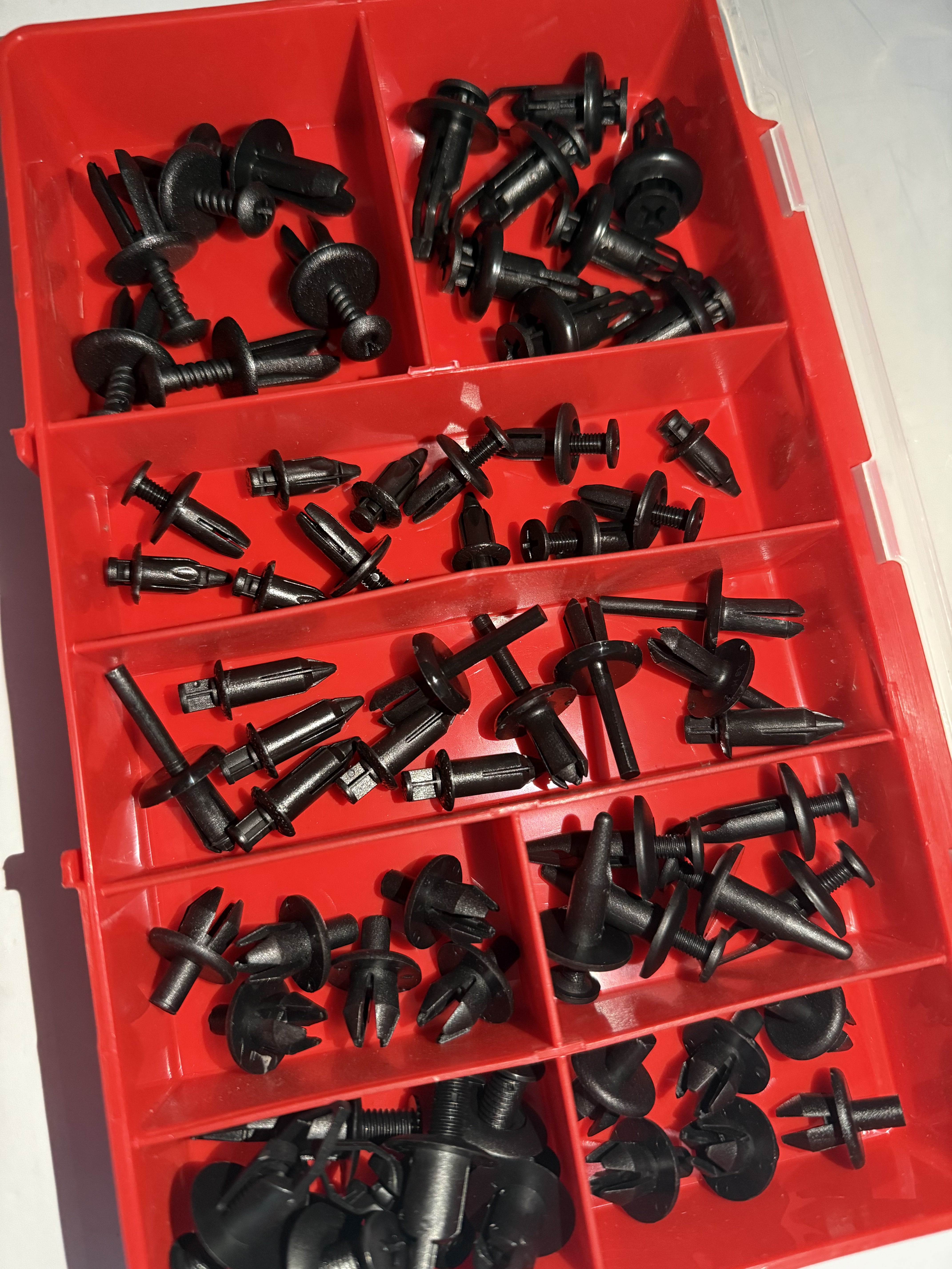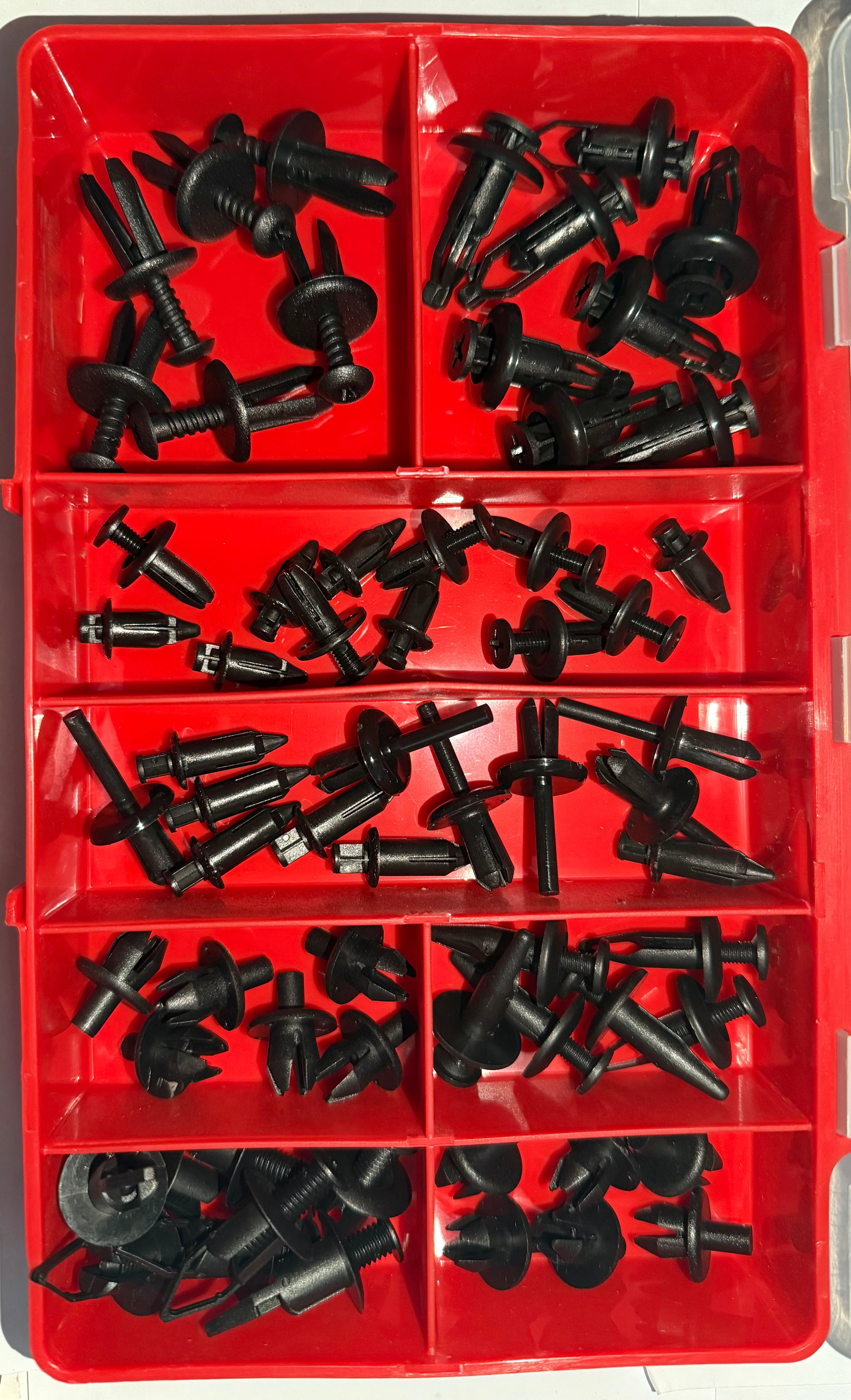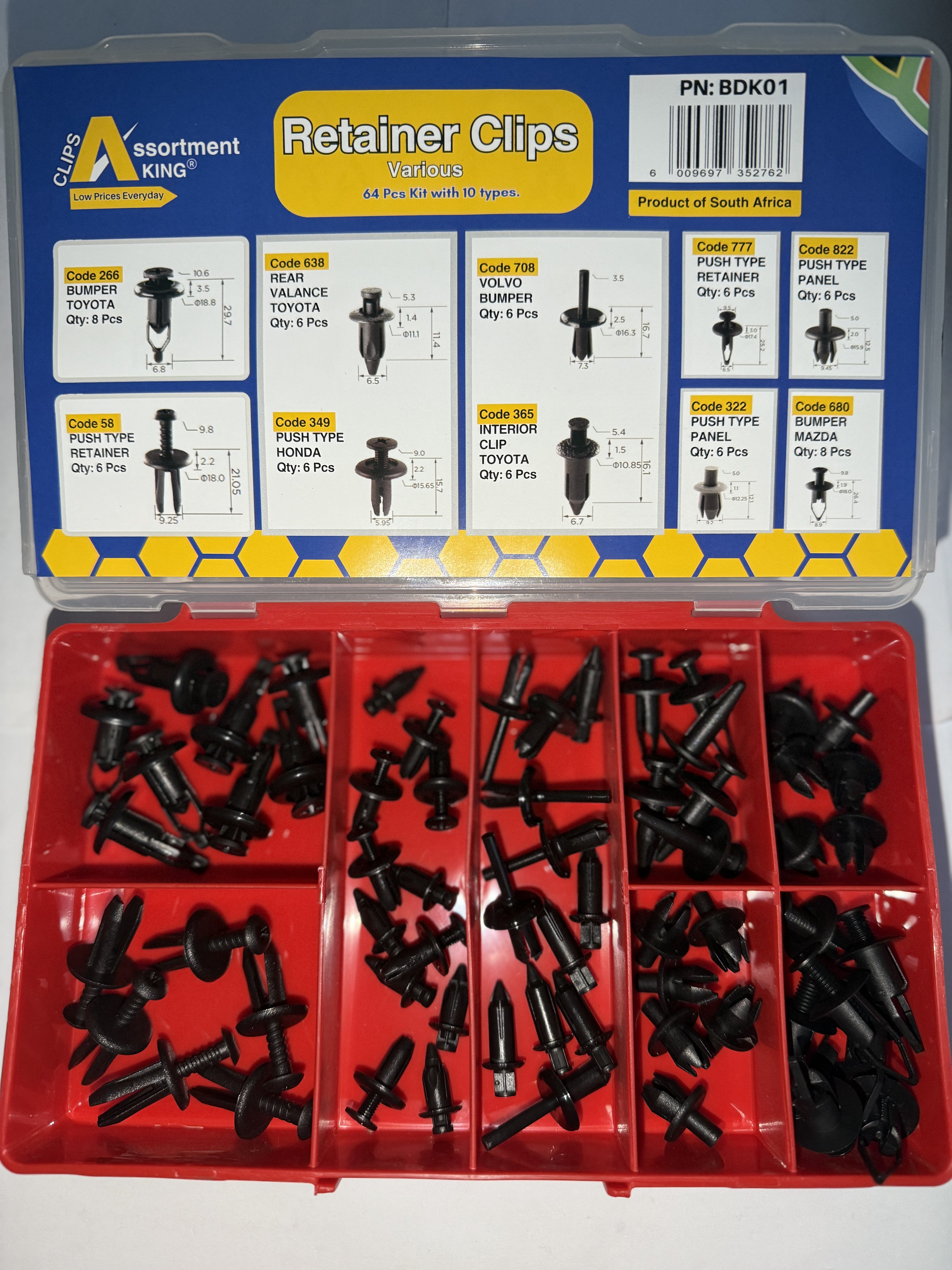 The BDK01 Retainer Clip Assortment includes a carefully selected range of push-type and specialty automotive clips used for bumpers, panels, and interior trim applications. Designed to match OEM standards, each clip ensures a secure fit without damaging surrounding surfaces during installation or removal.