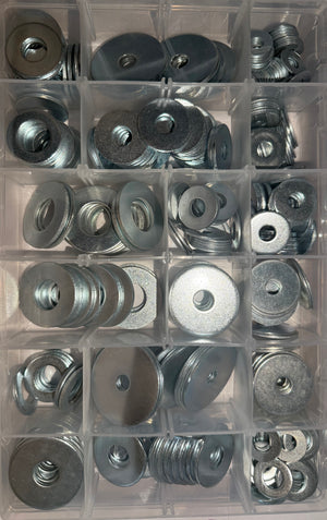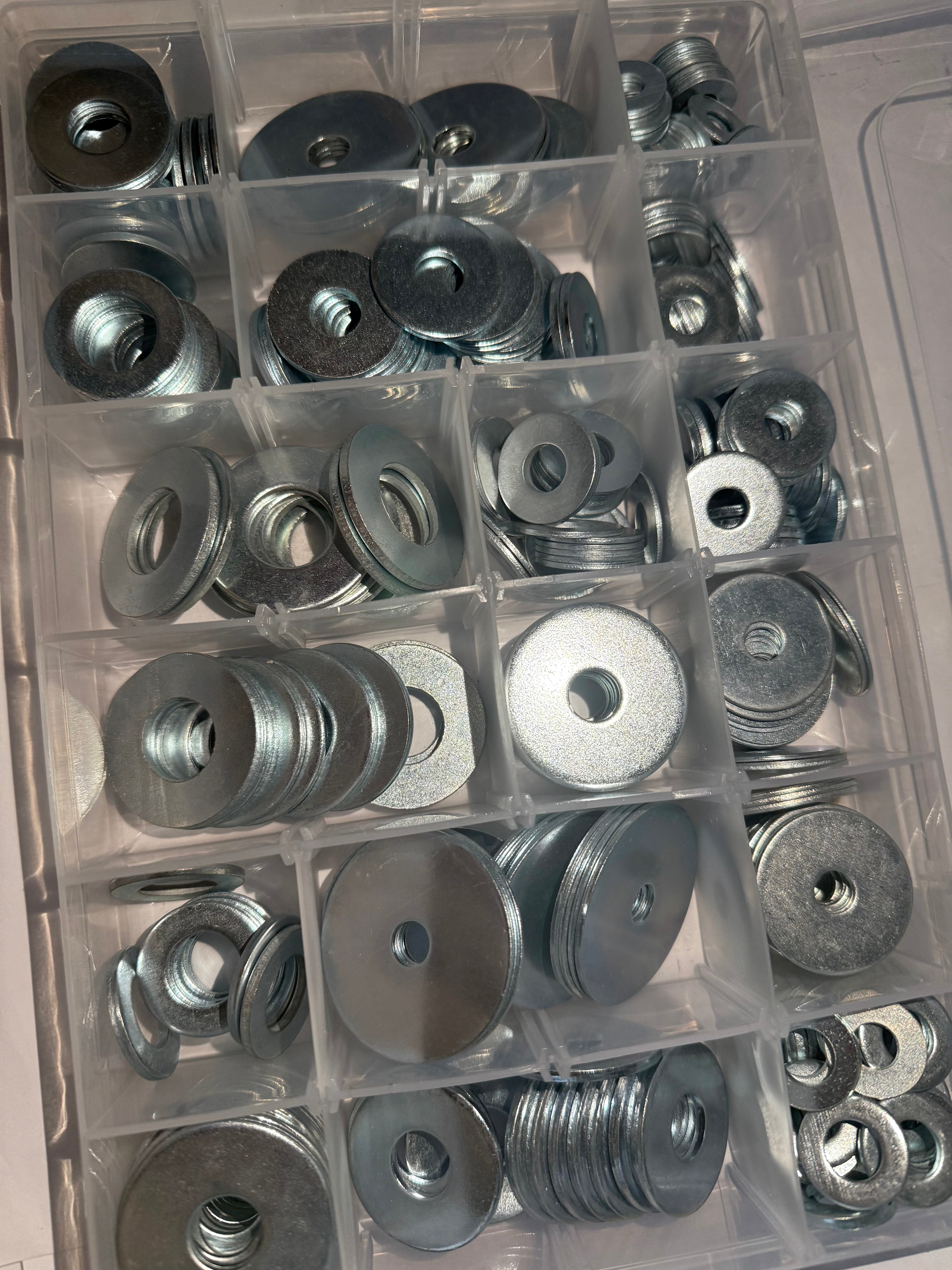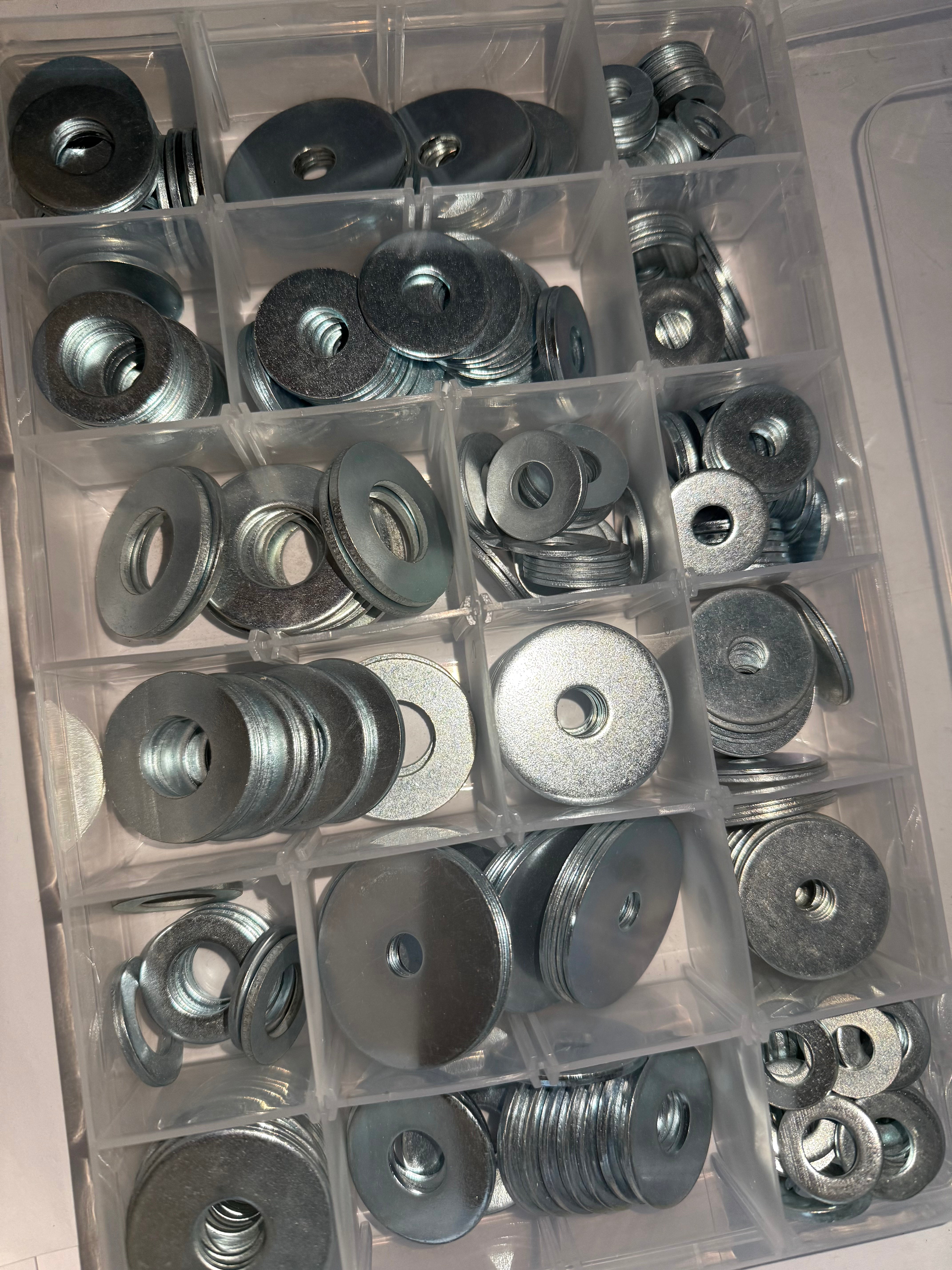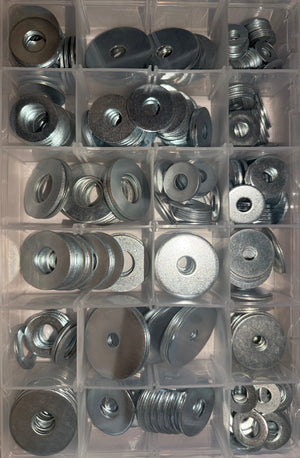 The HAK50 Special Flat Washers Kit offers a precision-engineered 390-piece collection of DIN 522 zinc-plated flat washers, tailored for heavy-duty load distribution, surface protection, and optimal fastener seating. These washers are manufactured in various specialized dimensions, including wider outer diameters and varied thicknesses, making them ideal for demanding mechanical and structural applications.
