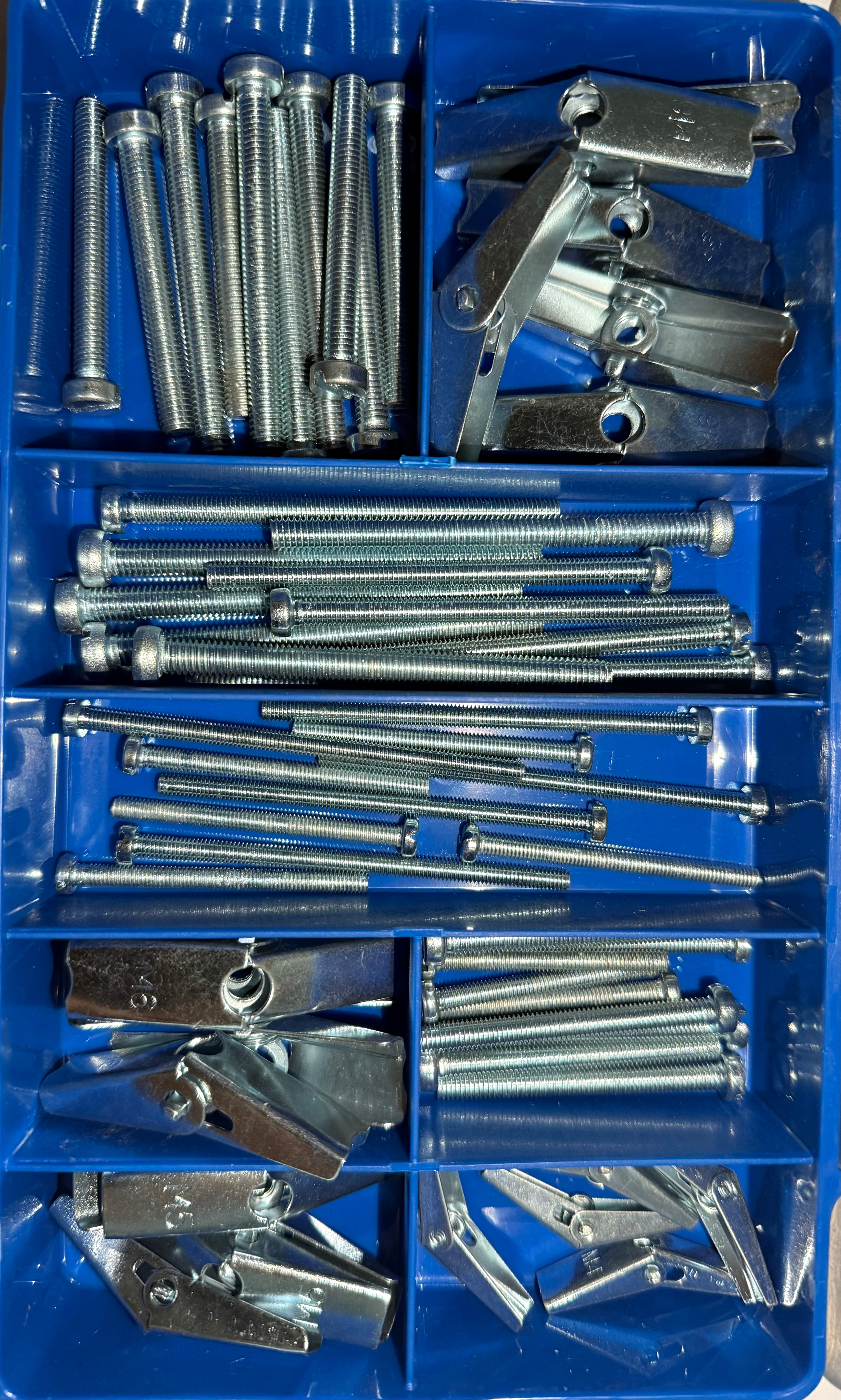 The HAK38 Spring Toggle & Machine Screw Kit is a 60-piece hardware assortment combining zinc-plated spring toggle wings and cheese head machine screws, ideal for secure and reliable mounting in hollow walls, ceilings, and drywall applications.
