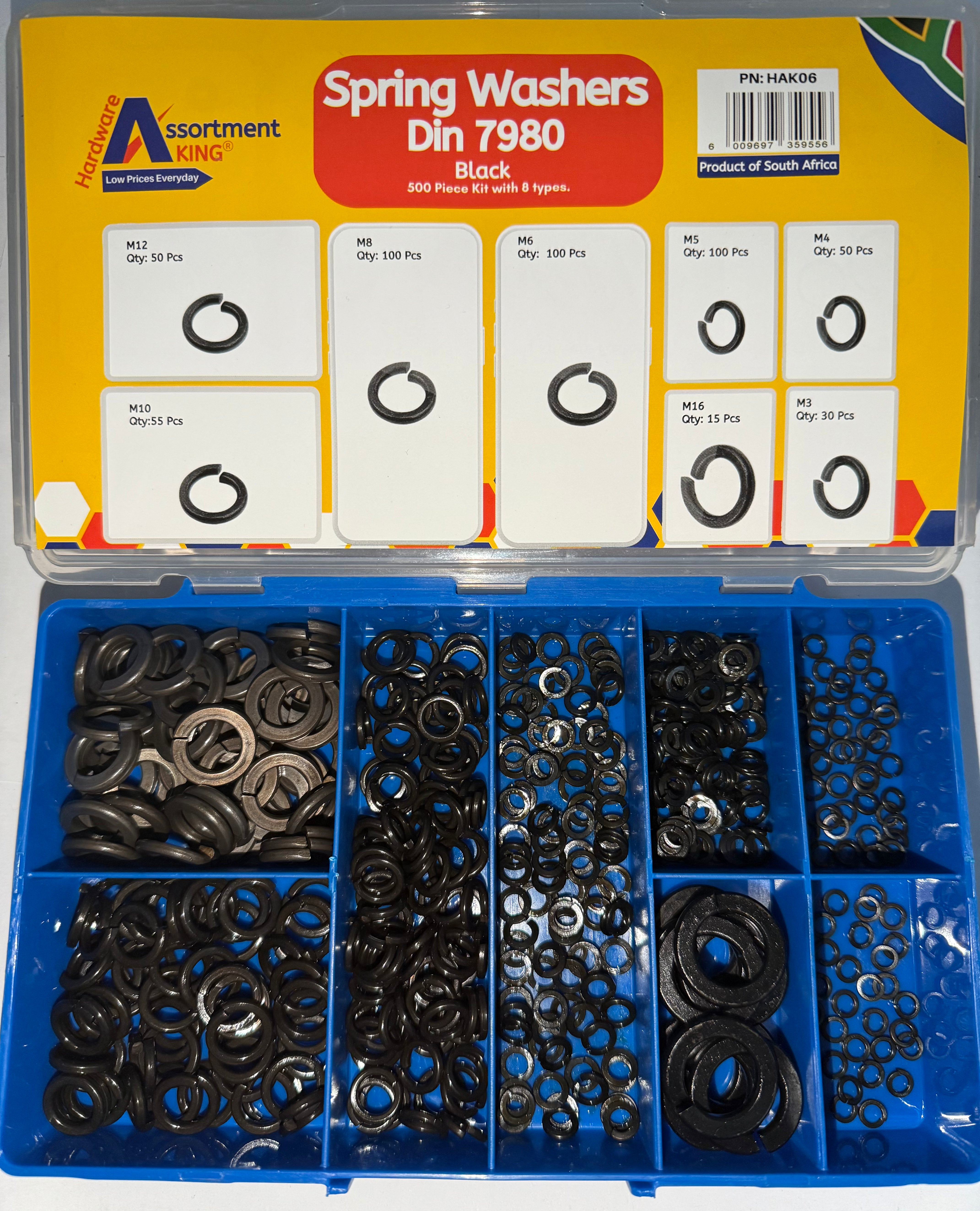 This 500-piece Spring Washer Kit, part number HAK06, includes a balanced assortment of Zinc Plated Spring Washers in various sizes from M3 to M16, all manufactured according to DIN 7980 standards. These high-quality washers are designed to prevent fastener loosening caused by vibration, movement, or thermal expansion.